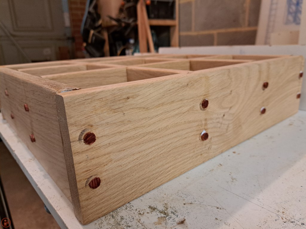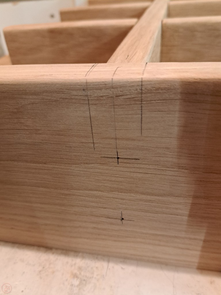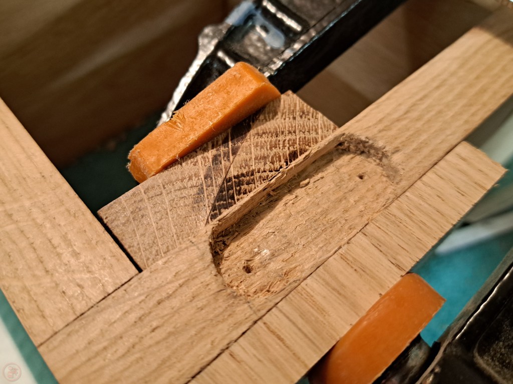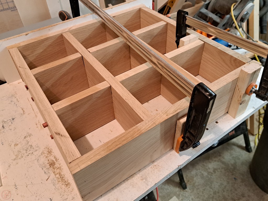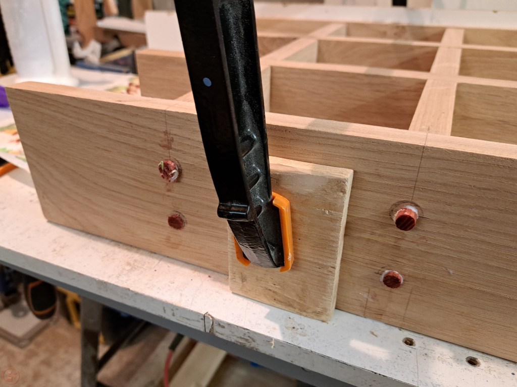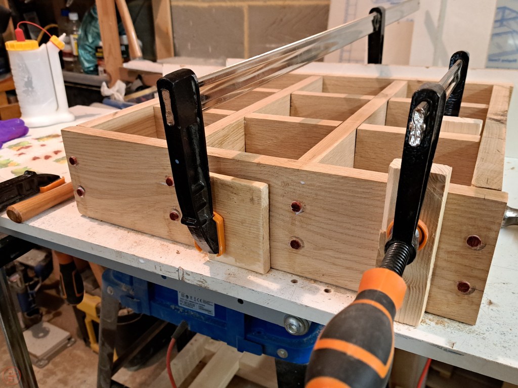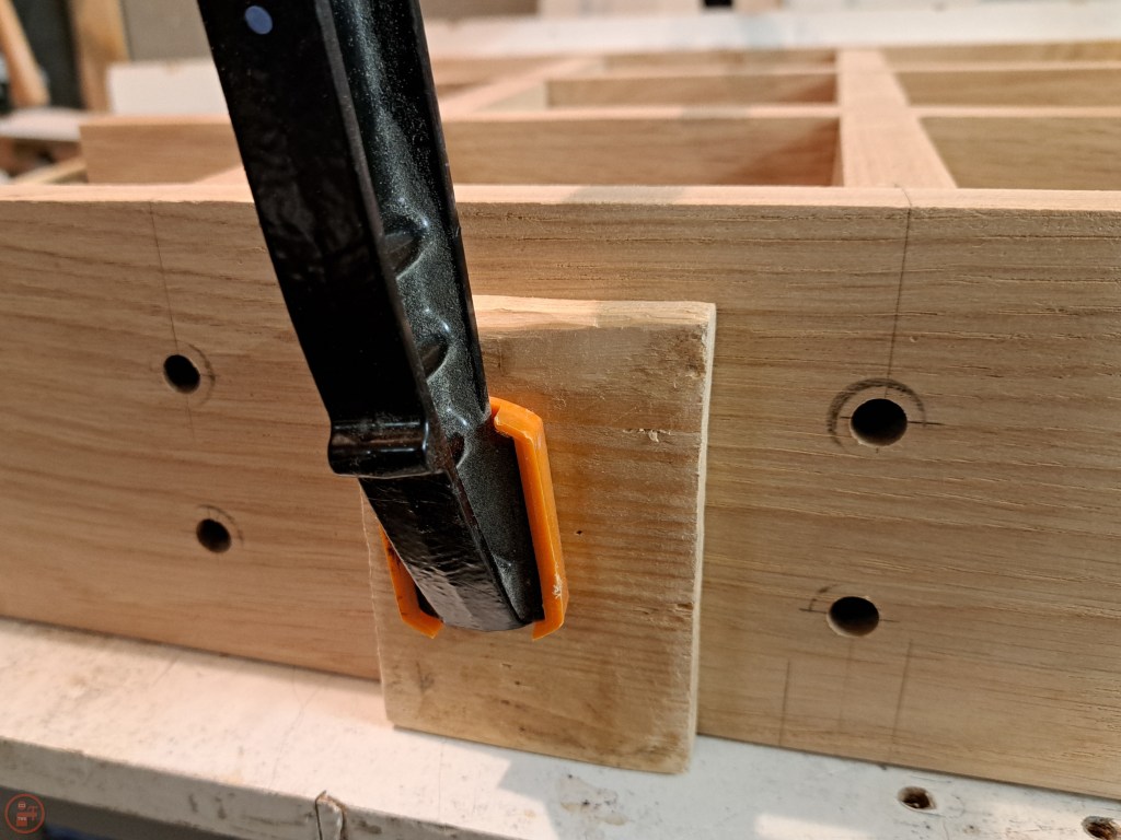 Once I was happy with the test fit, I moved to the glue up stage, using clamps and protective blocks to apply pressure while the glue dried. I marked the locations for and drilled holes in the outer frame to fit dowels through to hold the centre interlocking frame in place.