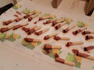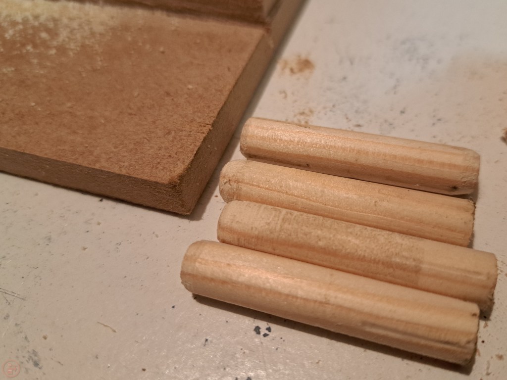 To match the colour of the crosses, I stained the end of the dowels red, but left the rest stain free so the glue could grab securely, as I wasn’t sure how the red dye might affect the permeability of the wood glue into the dowels. It did look a little odd to have a few red tipped dowels drying for a while though!