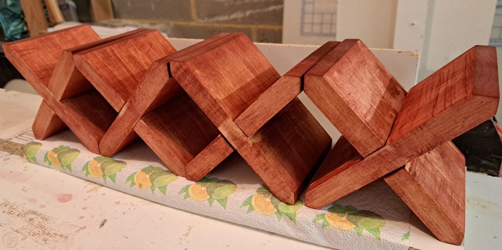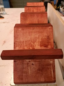 I also noticed that any glue residue affects the dye’s ability to permeate the wood, so can lead to a little blotchiness in places if there was significant glue squeeze-out. Fortunately, this was not a major issue in this case, and I was pleased with how the crosses looked after the dye had dried – red but not too lurid!