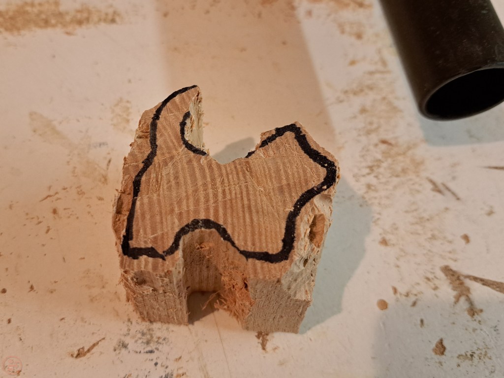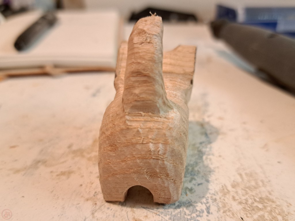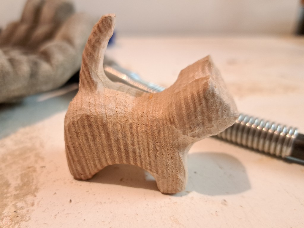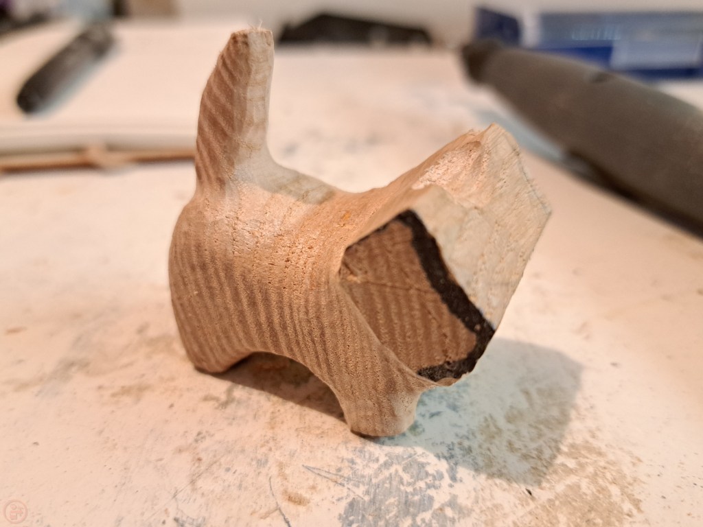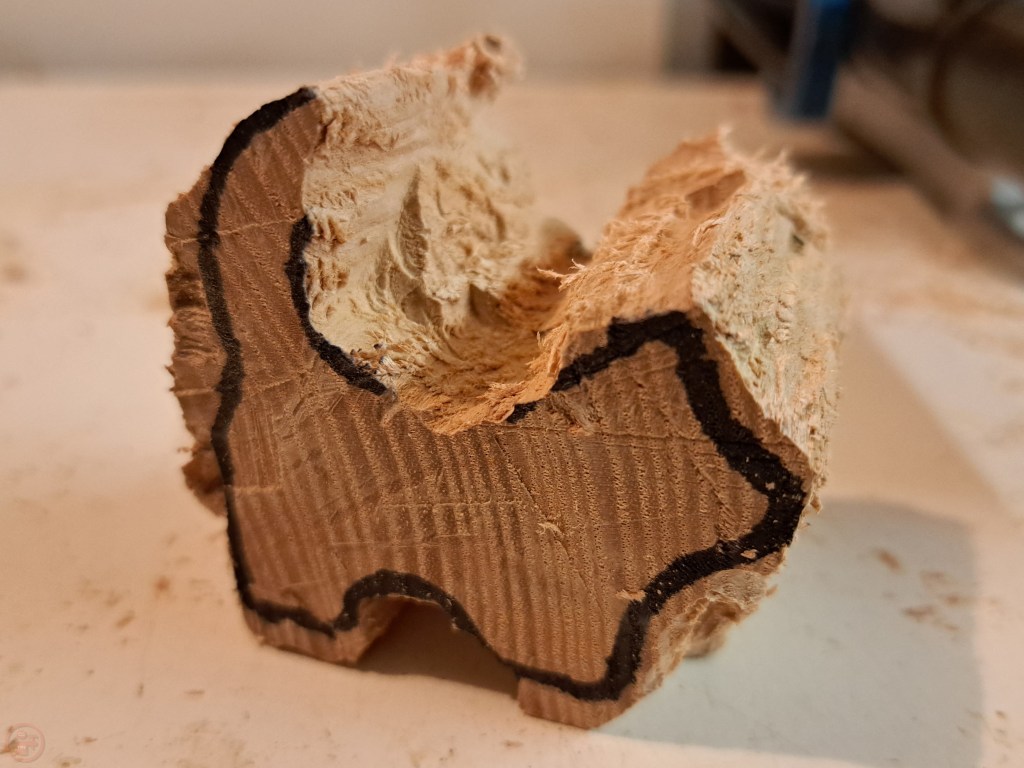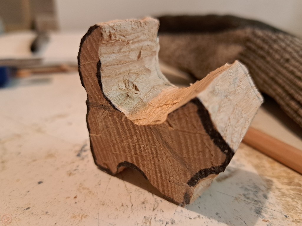 I used the template to identify a suitable piece of wood from a slice off an oak log and then cut it out using hand saws, leaving me with a small rectangular “slab”. I then set about removing material using my Dremel and a selection of different cutting and carving bits.