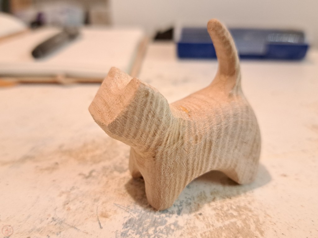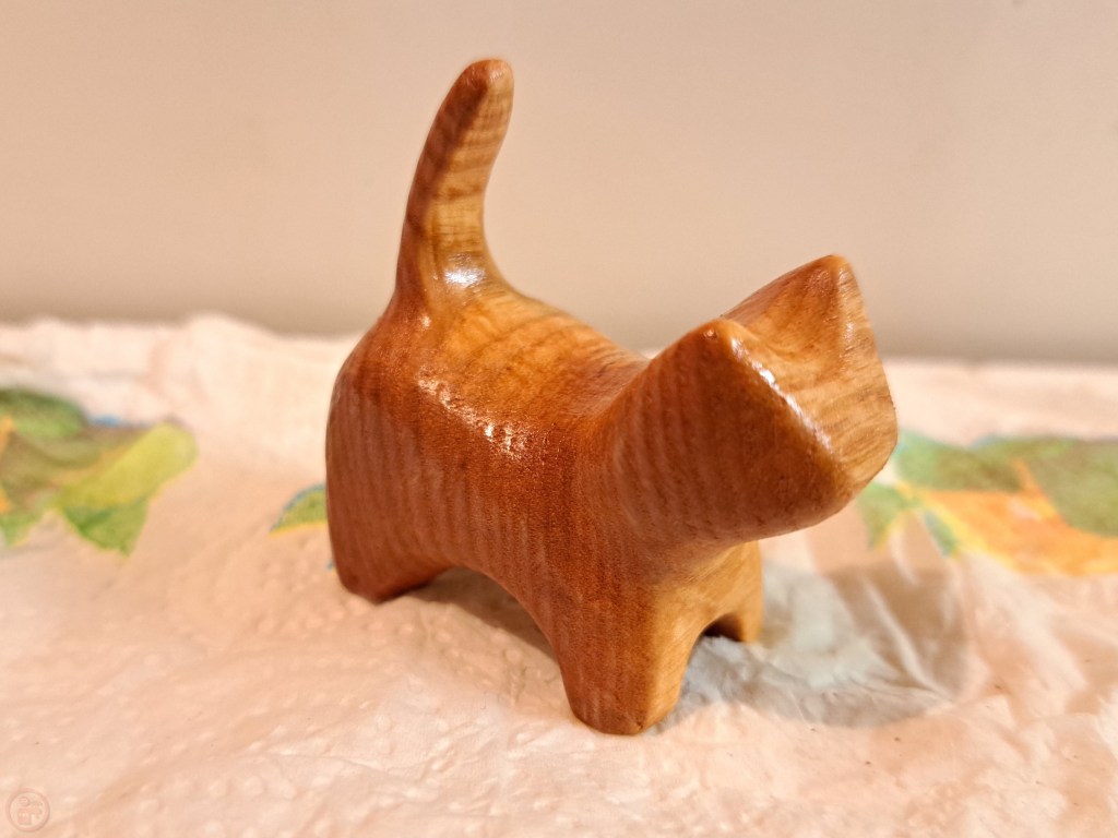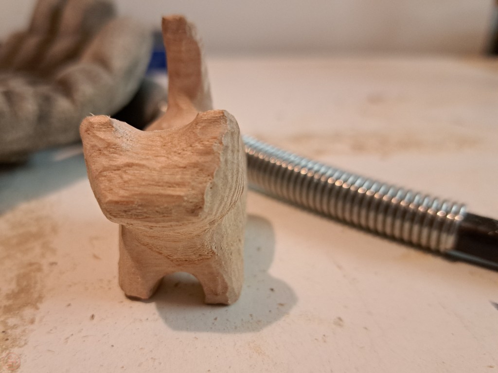 I carved a gap between the left and right paws in each pair and gradually reduced the thickness of the tail to create a delicate, slightly forward-curving shape. With the tight grain of the wood, it makes a the cat appear to have stripes, which I really like! As predicted, the head was quite fiddly but I took my time and just removed a small amount of material at a time, rotating the workpiece to look at it from multiple angles to make sure I was on the right track.