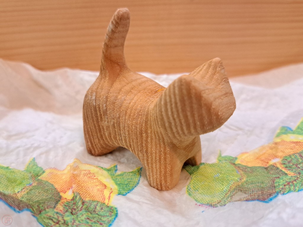 When I was happy with the finished shape, I sanded up to 180 grit to have a really smooth surface to touch, making it a nice experience to hold the cat. I sprayed the model with water to raise the grain, left it to dry and then resanded at 180 grit to ensure a smooth cat model following the application of finish. I made sure to sand the underside of the model, working the sandpaper in between the paws and around the front and back legs.