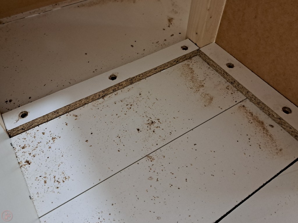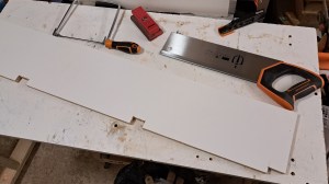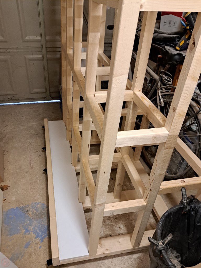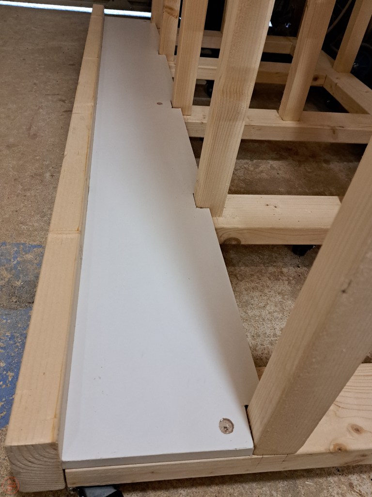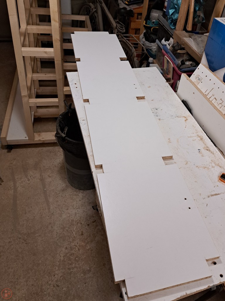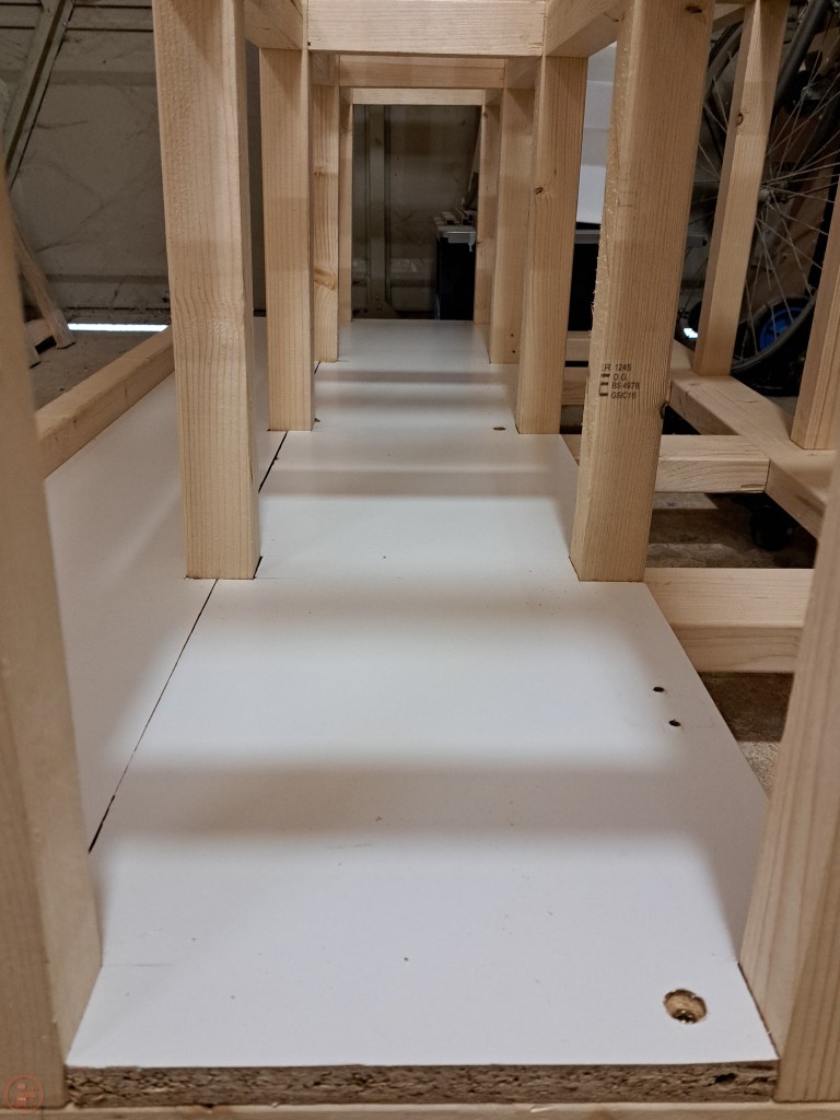 I started at the bottom and worked my way up, adding the outside base surface first. I still had a load of white melamine coated chipboard left over from a dismantled wardrobe, so decided that would be perfect for the lumber cart as: