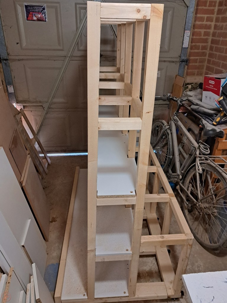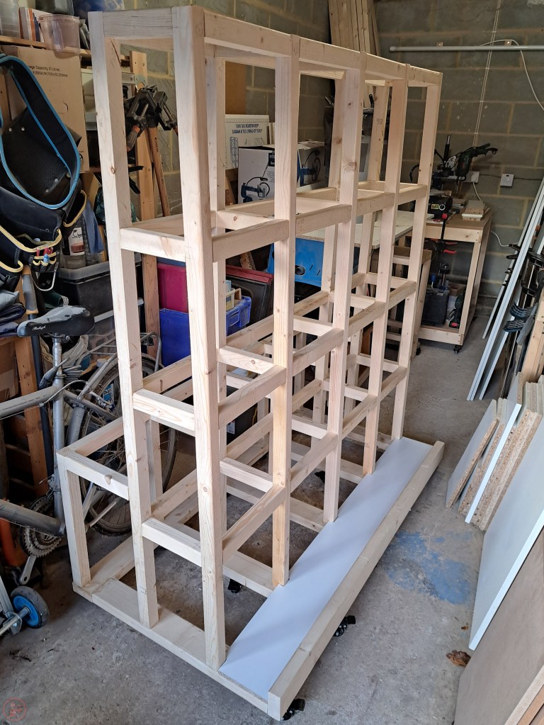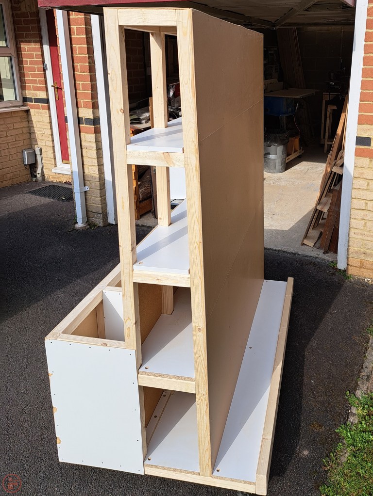 I repeated this process for the next shelf up, having to make each shelf custom, as the 87 degree angle on the sheet material side of the central A-frame, means the shelves get narrower further up the lumber cart. I’m good at making things delightfully complicated it seems!