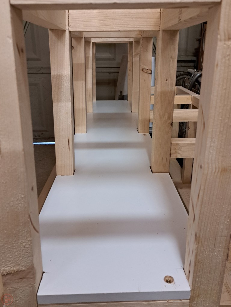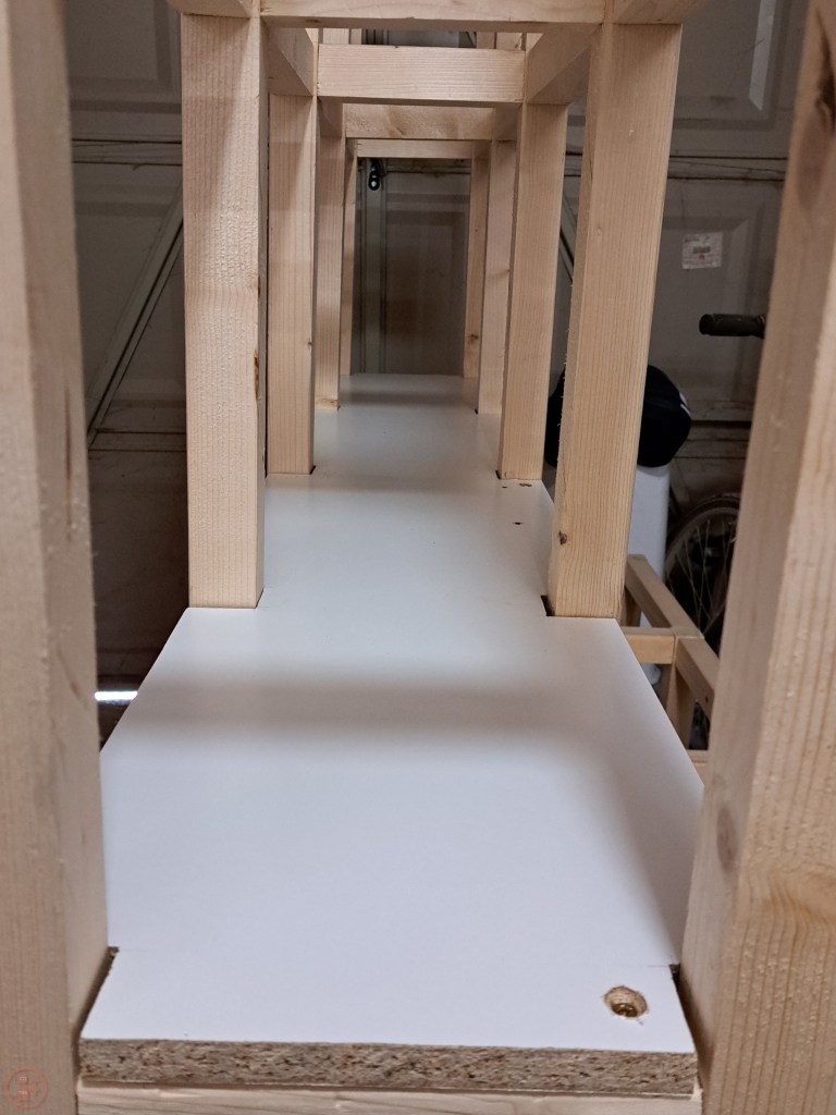 With the sheet material side and the centre shelves finished, I moved to the dividers side, which I will use to hold varying lengths of planks and beams. I used more white melamine coated chipboard to provide a base surface, using my remaining thinner offcut pieces together spanning the length. I added some additional blocks to the base between the dividers to give me a lower brace to tack the hardboard panels to. I also did the same with the back panels for each of the divider spaces, which I cut to fit inside each of the frame pieces and finish at the height of the third shelf of the A-frame in the middle.