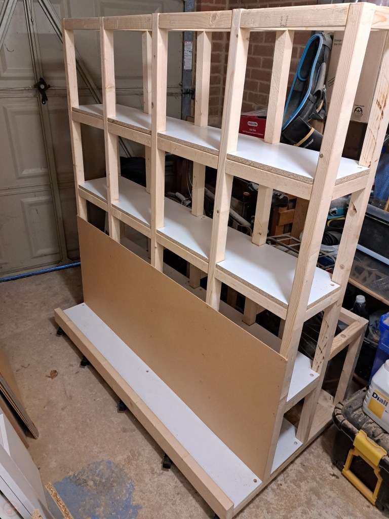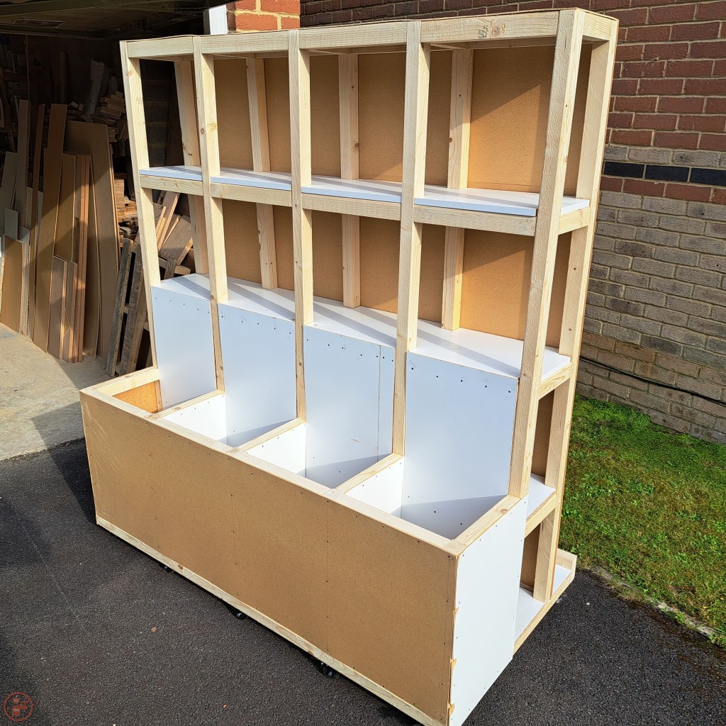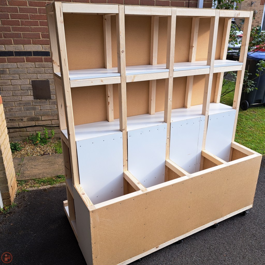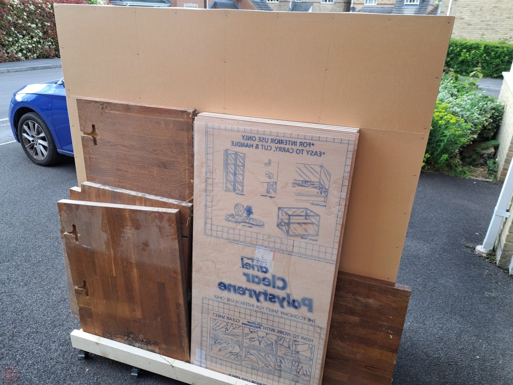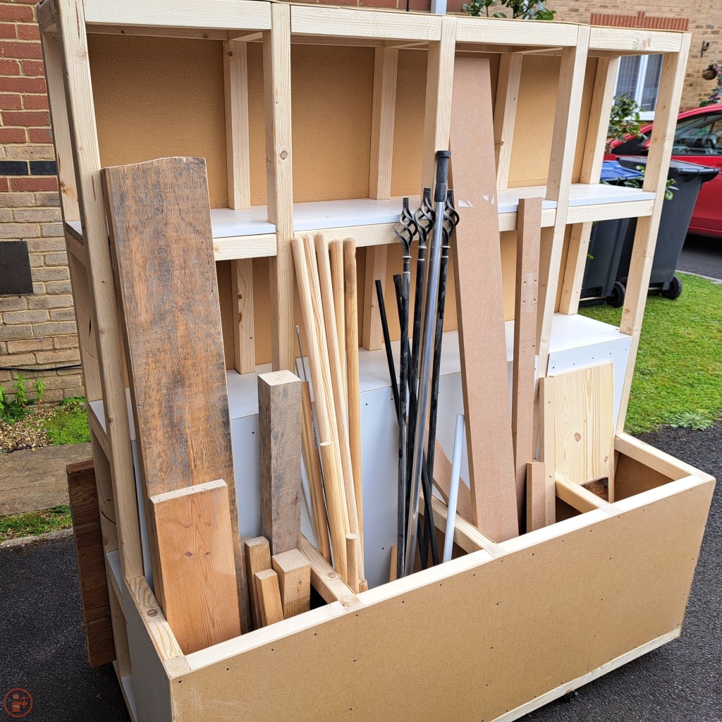 I fixed on the final piece of hardboard to the front of the dividers section and then wheeled the completed project out onto the front drive. It is something of a monster lumber cart and gives me a lot more space for storage than I currently need, but you know what they say – you always expand to fill any available space, so hopefully this has made me fairly future proof!
