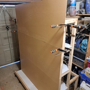 The final piece of hardboard stuck up over the top of the cart, so I clamped it in place and marked where to cut it to fit to run flush with the top (plus a little extra for the top surface). I used my circular saw to cut the hardboard to size and then clamped it back into place and used tacks to secure the final panel into place on the side.