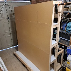 Once I had all the four centre shelves completed, I moved onto the sheet material side. I didn’t want this support face up the A-frame to be particularly thick, so I wouldn’t lose storage space between the A-frame and the raised stop. I was also conscious to avoid adding unnecessary weight higher up the lumber cart and risking making it unstable when pushing it around. I therefore used some thin hardboard to run the length of the cart, which addressed my two concerns. The weight of sheet material leaning on that side is held up by the central (very solid!) A-frame so I wasn’t concerned about needing something more sturdy. The hardboard was lightweight and also sufficiently thin to make minimal difference to my storage space for sheet materials.