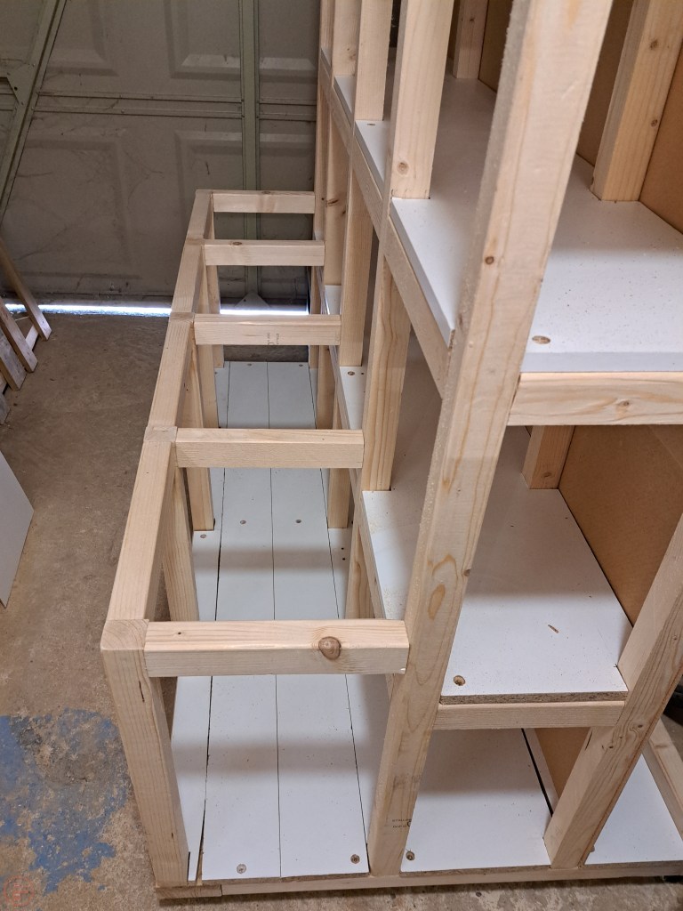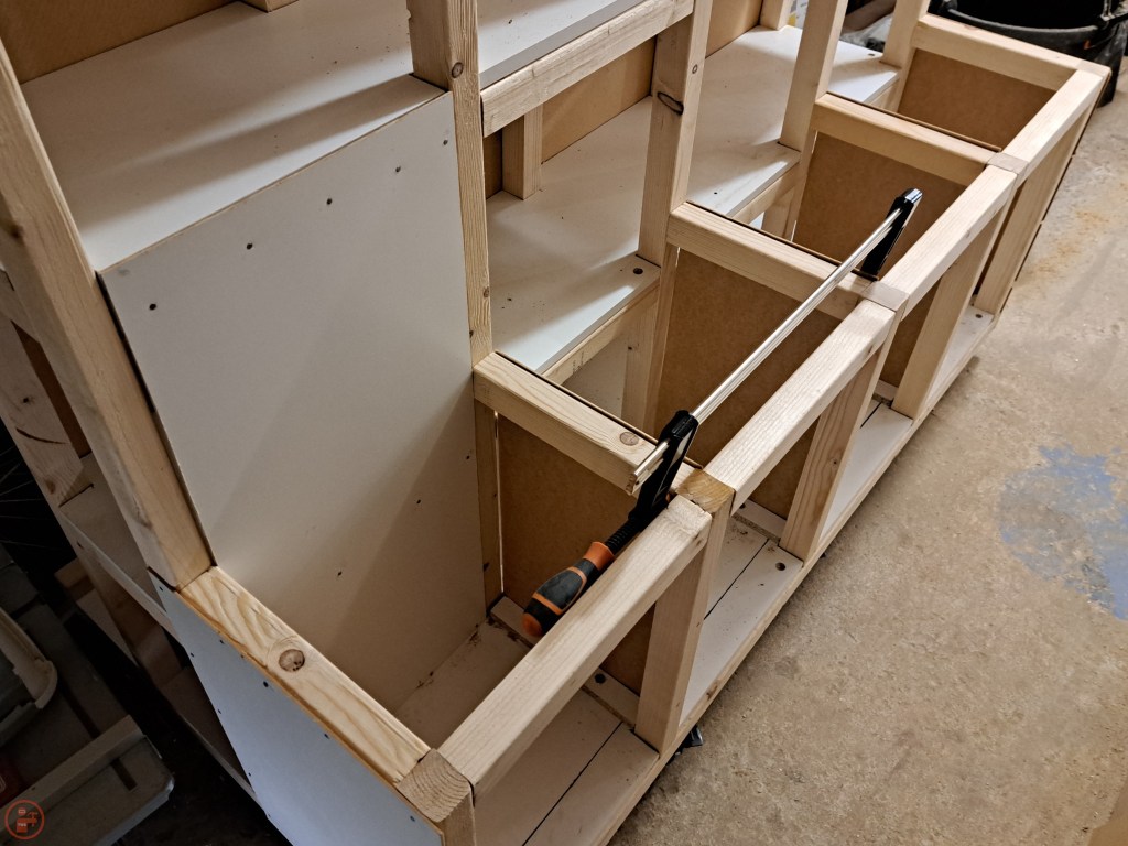 I moved onto the more fiddly middle shelf space, which required each shelf to be notched on each side to fit into the space between the various upright posts. This was quite fiddly and took a little bit of time going back and forth between the cart and my saw horses to get the fit dialled in correctly. Again, some gentle taps followed by drilling and screws to hold it in place and the centre base section was complete.