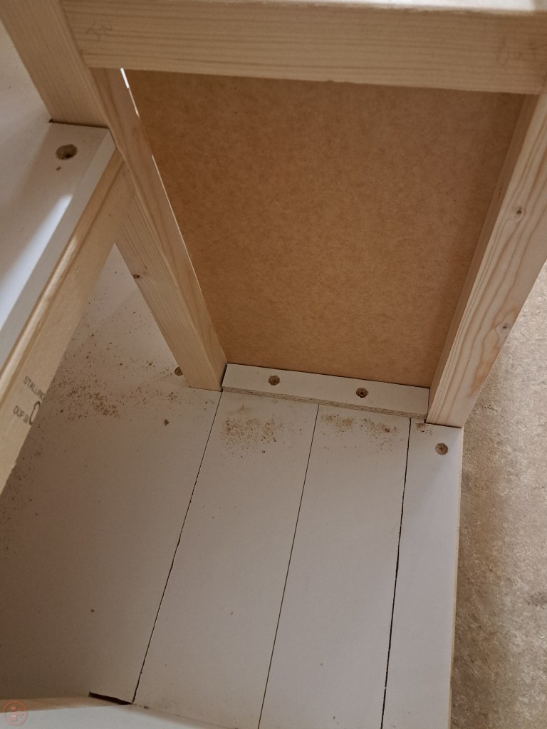 I cut notches out of the side of the sheet material base next to the central posts and then slid it into position, using some gentle persuasion taps with a rubber mallet. I drilled pilot holes and counter sunk some screws into the base to hold it in place. It didn’t need loads of screws to secure it, plus the weight of everything on top once it’s in use will keep it pretty securely held anyway!