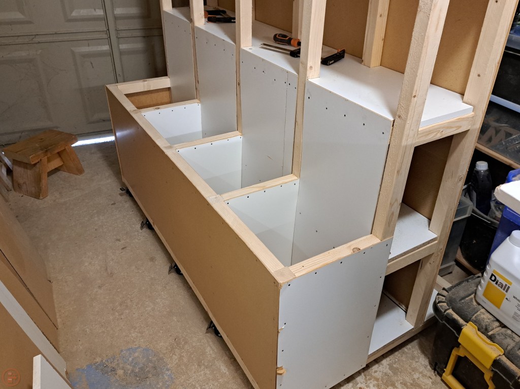 Having completed the skeleton frame previously and added casters, the next steps were to add the various dividers, shelves and panels to turn it into a usable lumber cart.