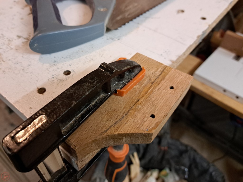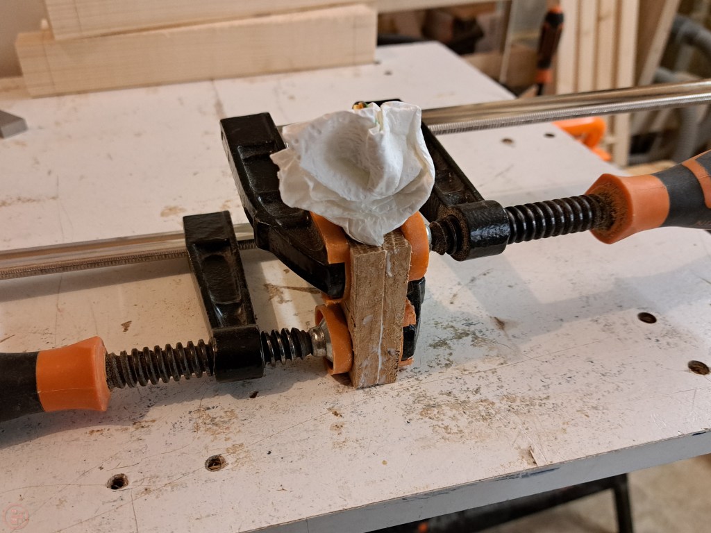 I gave both pieces a sand to make the joining edges flat and then clamped them together to test the fit. As I was happy it was a sufficiently snug fit but not too stiff, I glued the two pieces of oak together, using some kitchen roll to soak up any glue squeeze out inside the sheath.