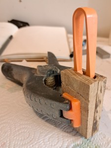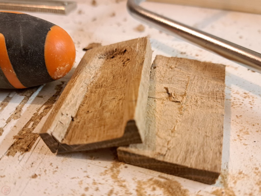I cut some oak to the right dimensions using a coarse cut hand saw and then ripped it in half to give me two thinner pieces. I then chiselled out a suitable size indent in one side for the blades of the pruning scissors to fit into.