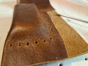I punched holes at regular intervals around the edge using an awl and then sewed the leather together to secure the oak piece within the leather holder.