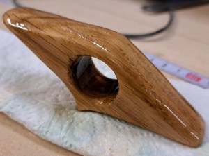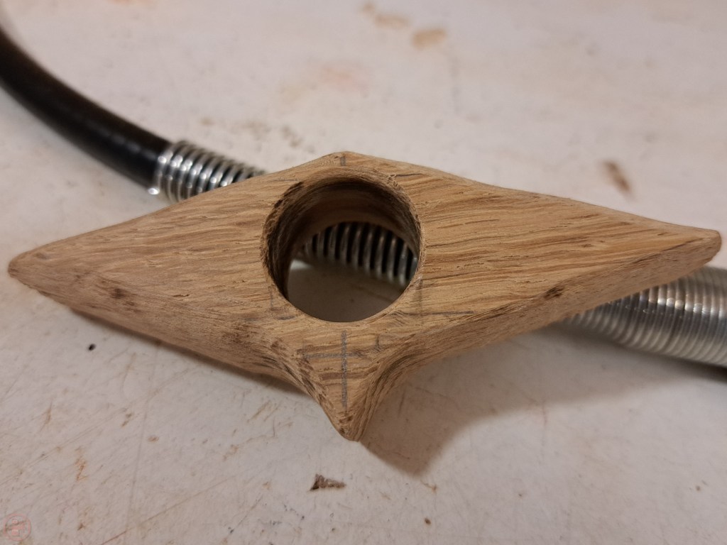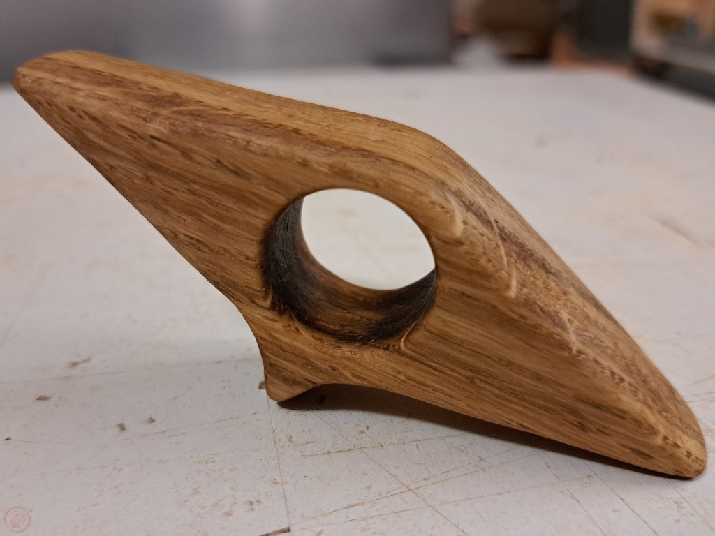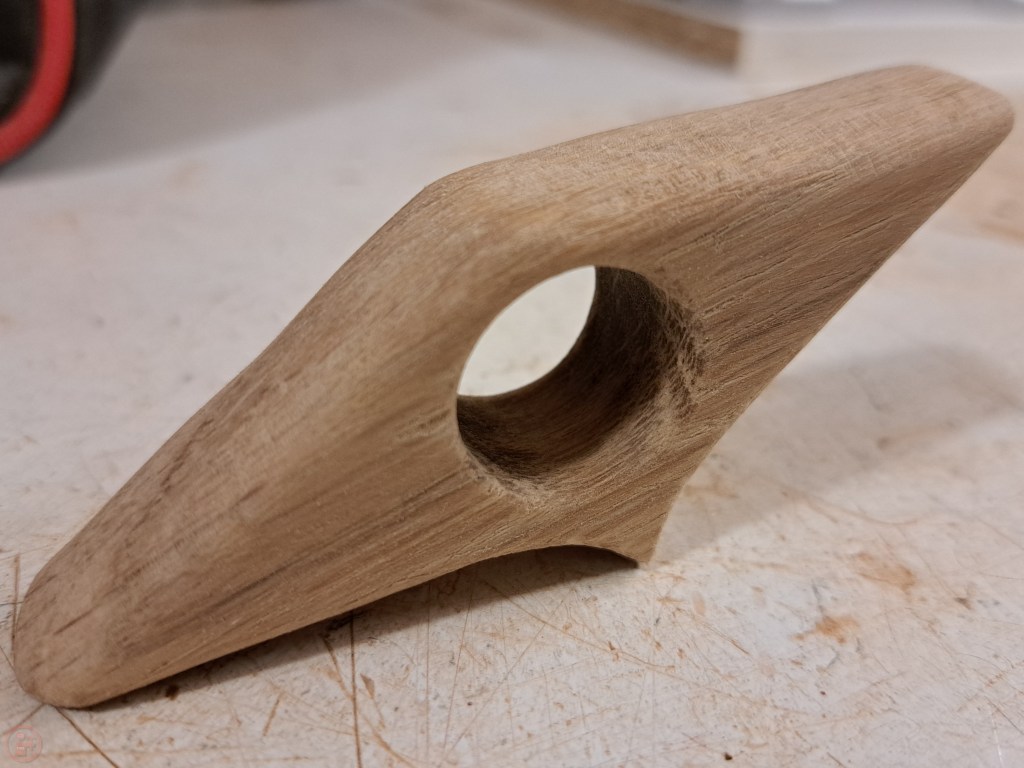 I therefore reviewed the book holder design and added a longer lower section. I selected another piece of oak, drilled out the centre hole using a Forstner bit and then rough cut the shape using a hand saw. I refined the shape using my Dremel (not sponsored) and then hand sanded up to 120 grit.