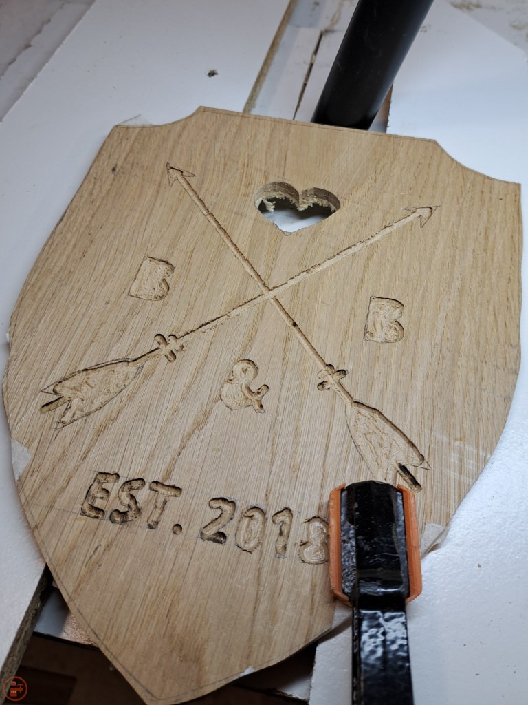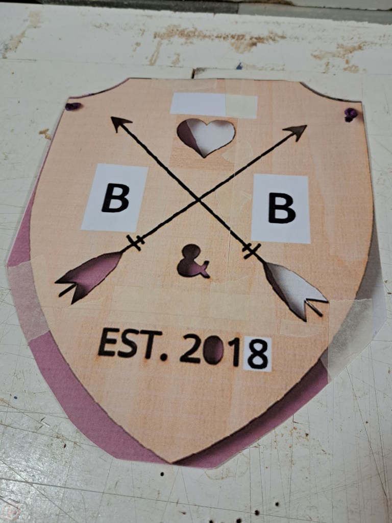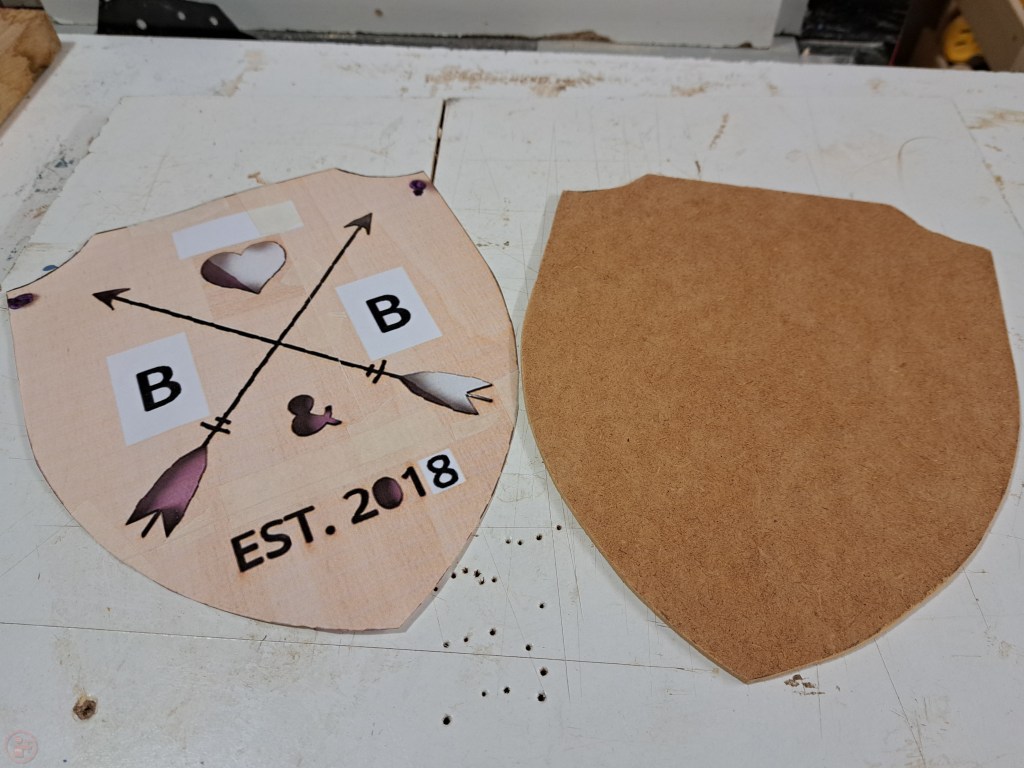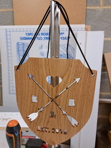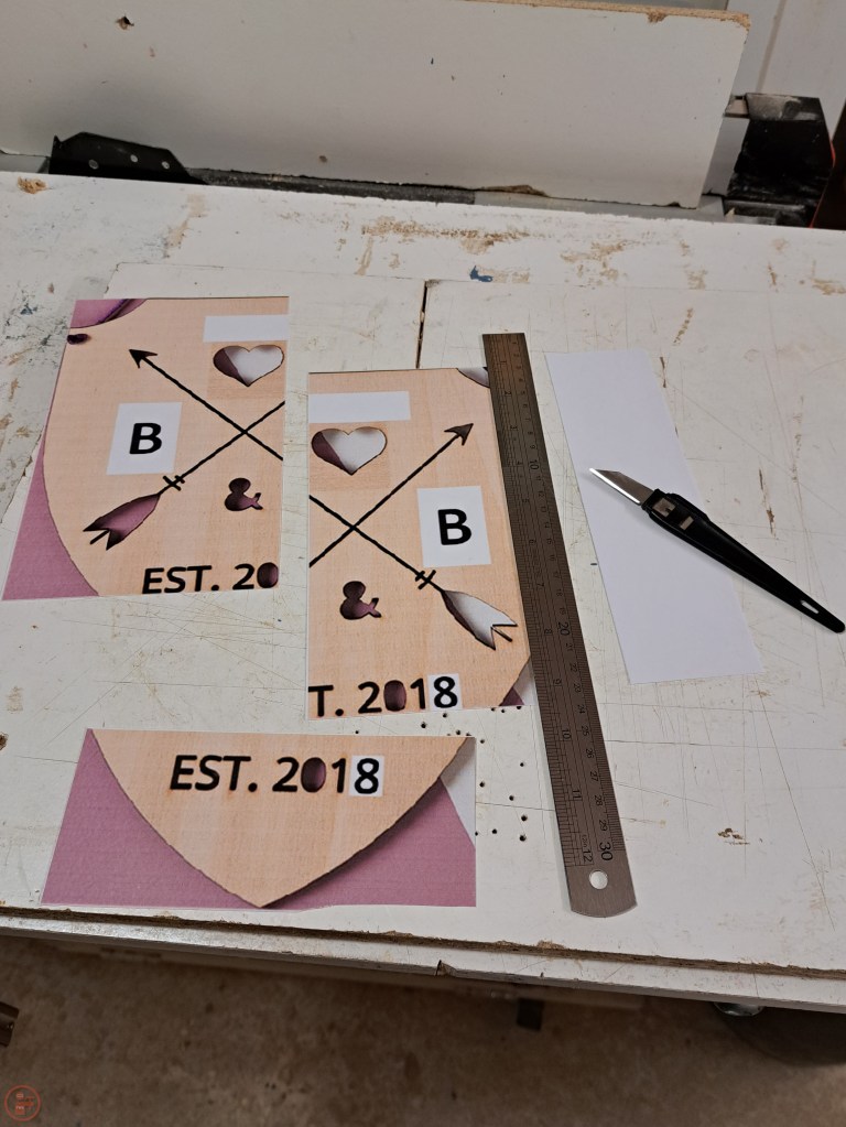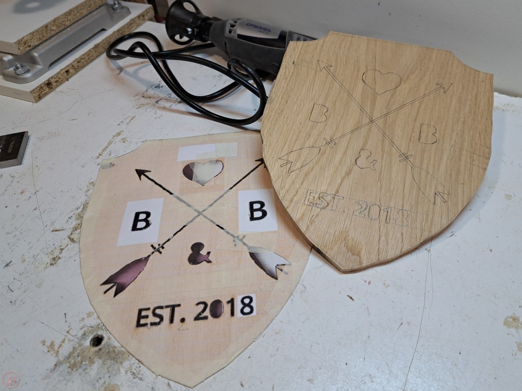 I decided to make them a custom wooden plaque, which could be hung up on the wall in their house. I started with some online searching for designs and settled on a shield shape, with crossed arrows, a heart and their initials and wedding year. I printed out the templates and taped the various pieces together, after carefully cutting them out with a scalpel and overlaying them to make one complete shield.
