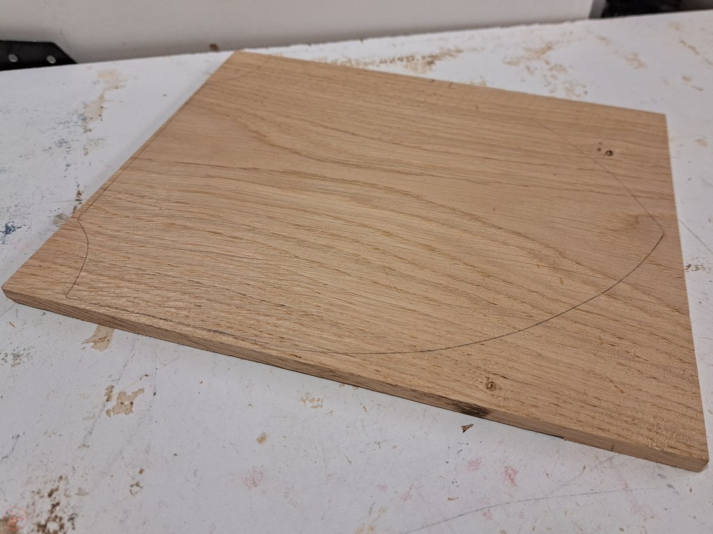 As the paper was quite thin, I decided to make a hardboard template. I drew round the template on the oak board, running the grain vertically through the plaque.