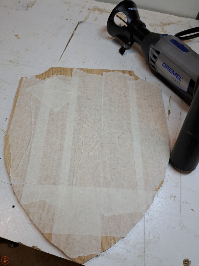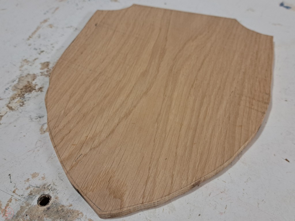 I cut the oak board to the rough dimensions in length and width and then ran the board through my table saw on its side to slim down the thickness. This was a bit of a challenge, but I took my time. I used an electric planer and my random-orbit sander with a 40 grit disc to remove the saw marks and give me a nice flat face on both sides of the board. I then used my jigsaw to cut out the rough shield shape.