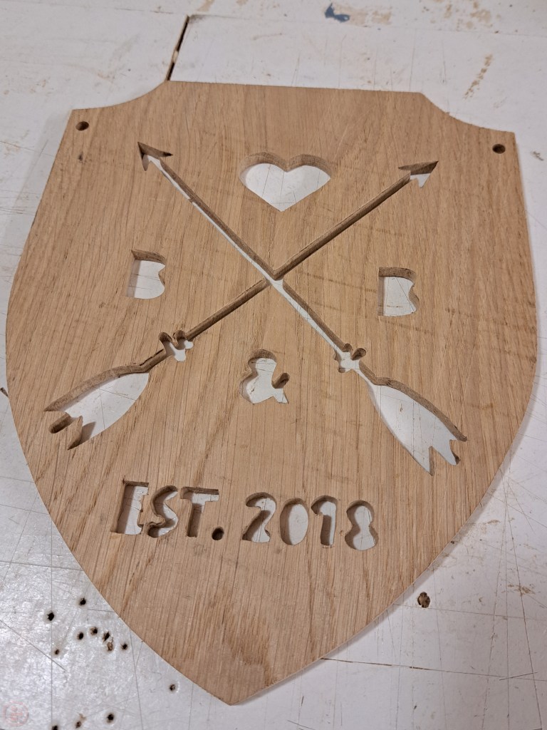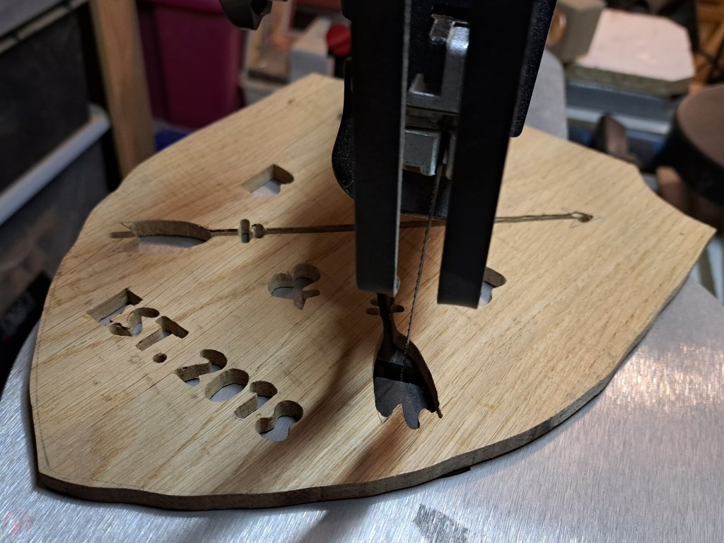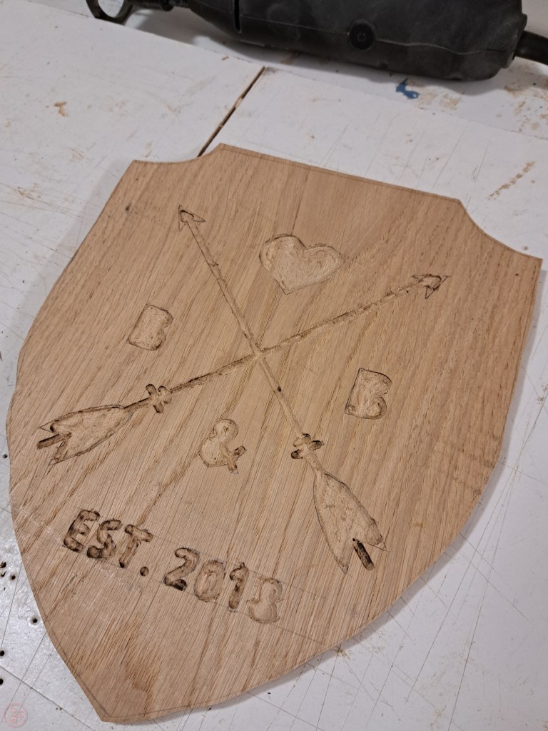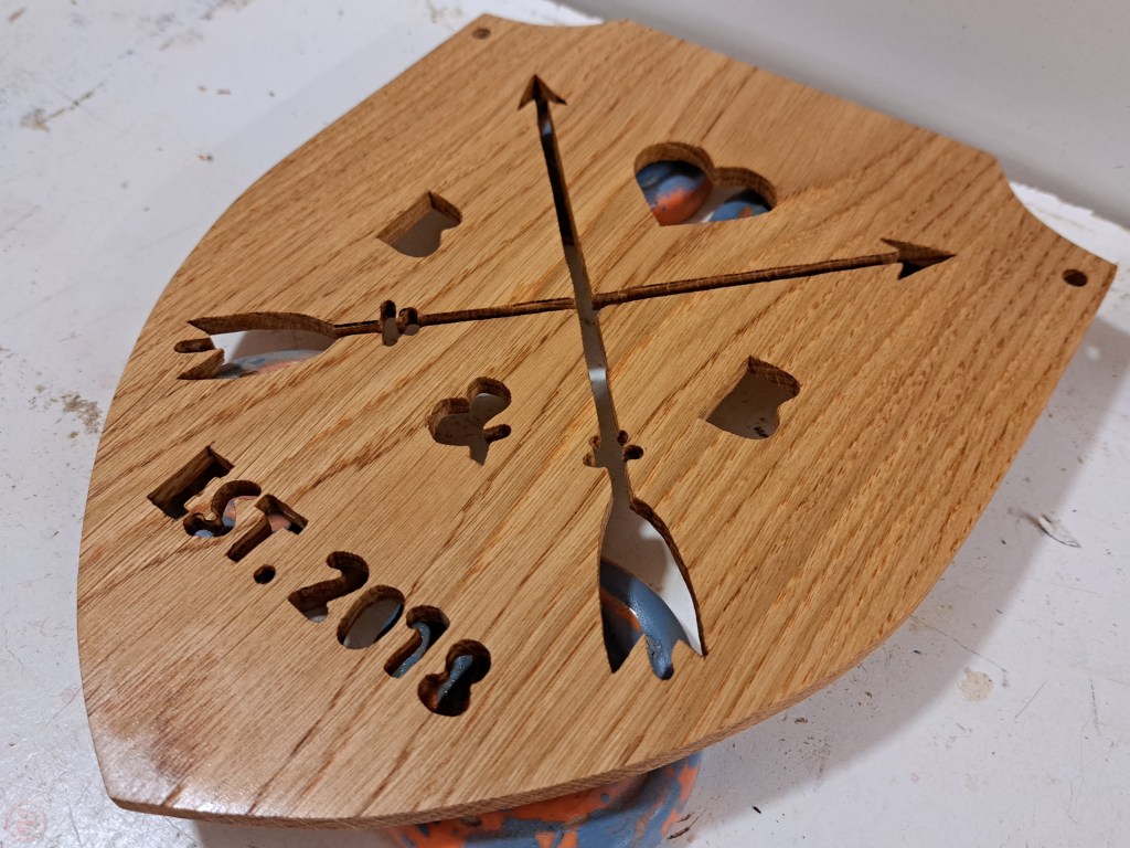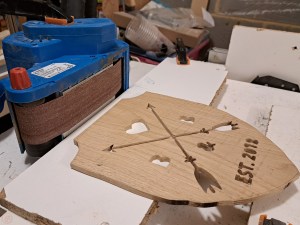 I repeated this process for all the details, taking my time to carefully follow the shape of the letters and numbers. The arrows were quite fiddly and I struggled with getting a straight line using the Dremel. Once I had finished all the carving, I switched to using my scroll saw, which allowed me to make refinements to the carvings, including removing material from the fletching and arrowhead ends of the arrows to clean up the design and getting a nice straight cut for the body of each arrow.