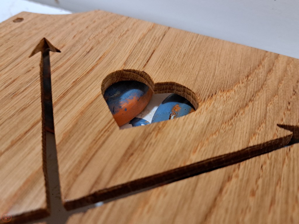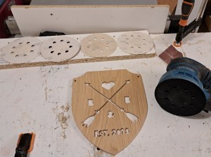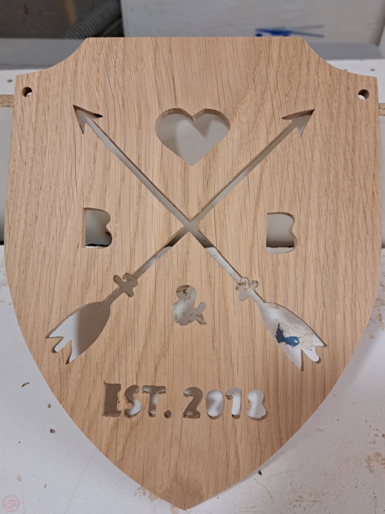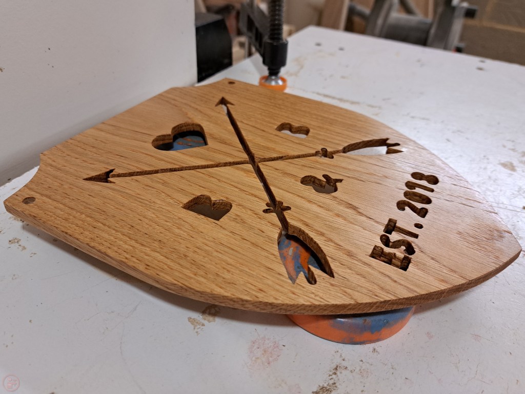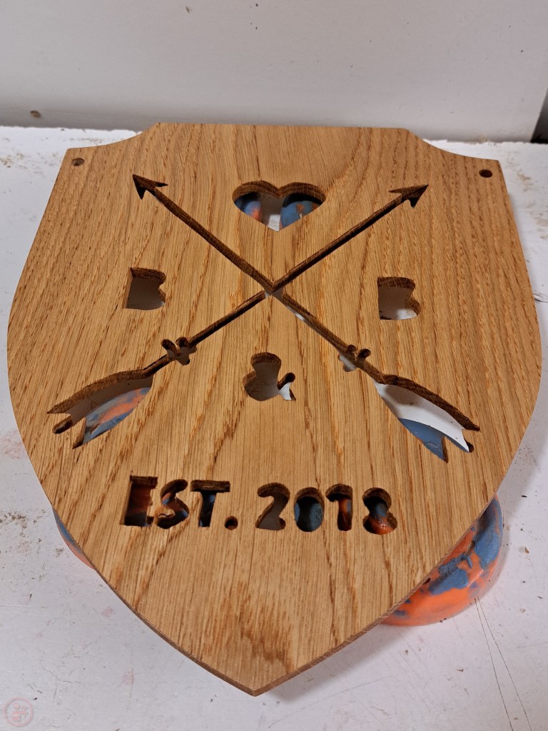 I repeated this process for all the details, taking my time to carefully follow the shape of the letters and numbers. The arrows were quite fiddly and I struggled with getting a straight line using the Dremel. Once I had finished all the carving, I switched to using my scroll saw, which allowed me to make refinements to the carvings, including removing material from the fletching and arrowhead ends of the arrows to clean up the design and getting a nice straight cut for the body of each arrow.