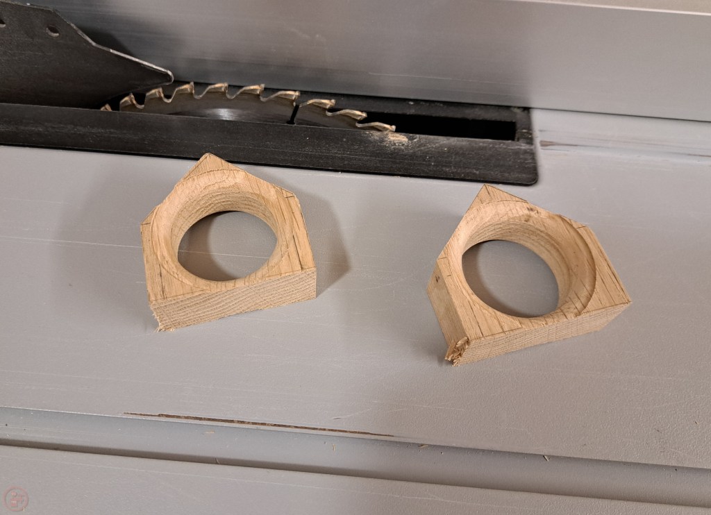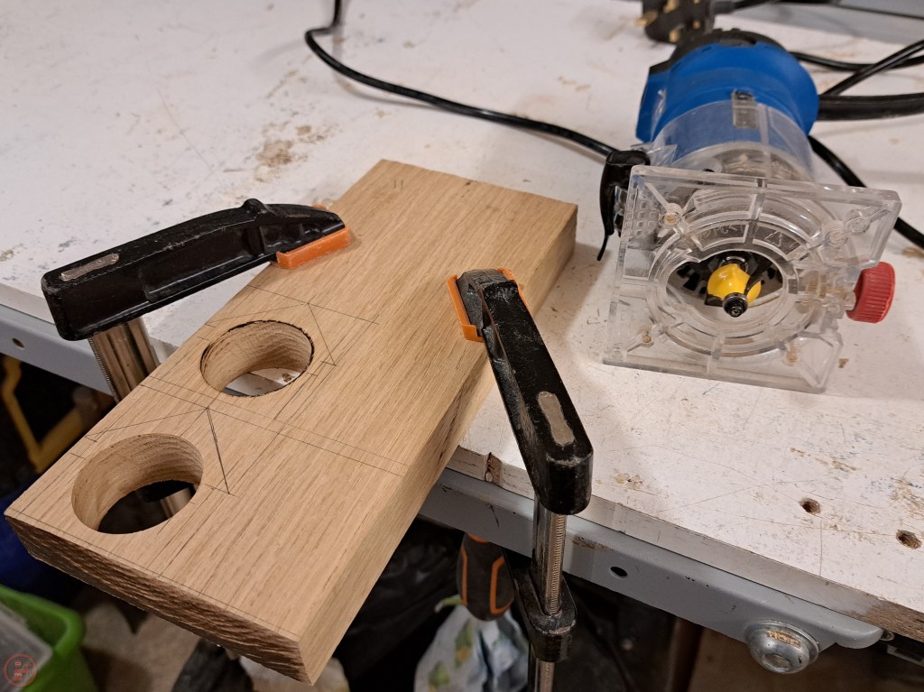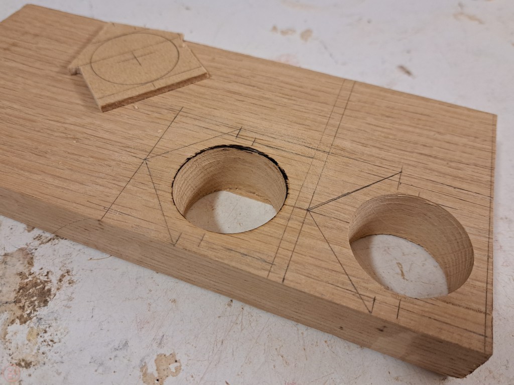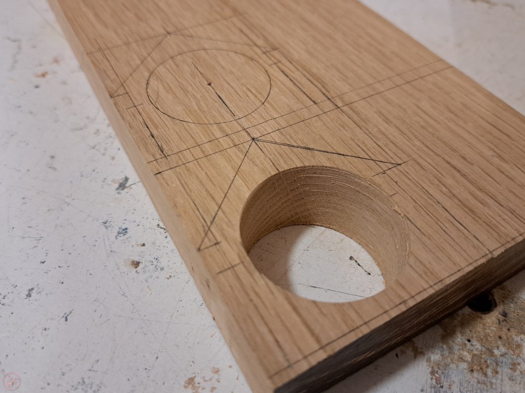 I selected a piece of oak stock to use as I wanted the grain to be tight to hold the details nicely without breaking. I made a small template out of some scrap plywood and used the template to draw out two houses on the oak. I realised it would be much easier to cut the holes in the middle before cutting the rings to size, so the first step was to carefully drill large holes through the middle of each house shape using a Forstner bit.