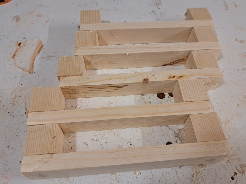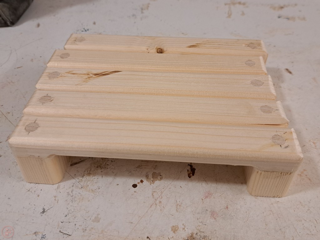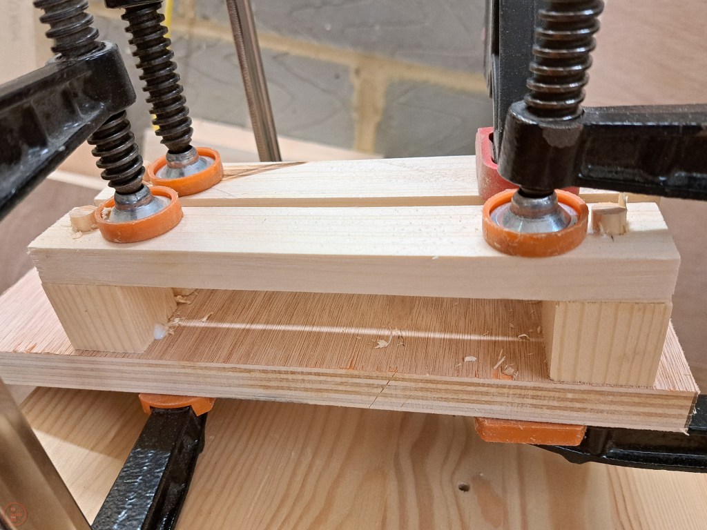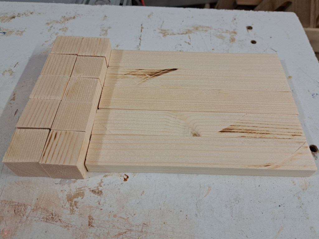I needed to make five drawer pulls for the Mitre saw bench drawers so I decided to use some pine left over from a previous project. I cut the pieces to rough dimensions and then glued the blocks onto the longer pieces. I clamped the pieces to a piece of plywood to hold them in place, drilled a hole through from the top, and glued in a dowel to strengthen the joint.