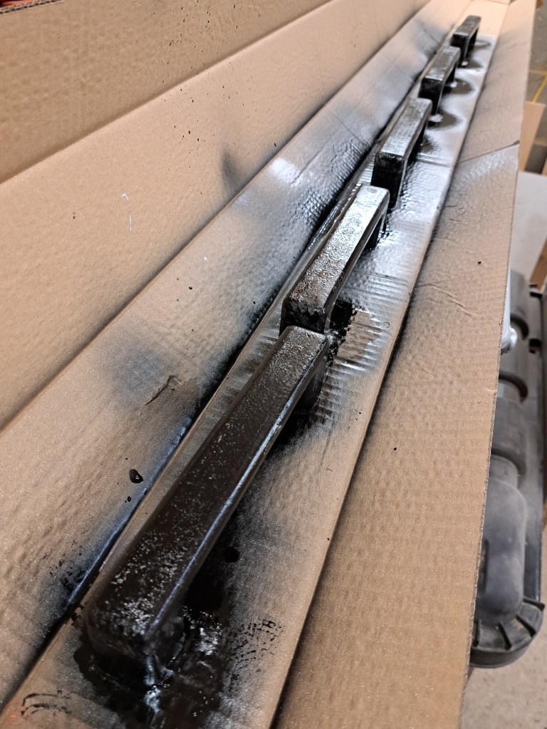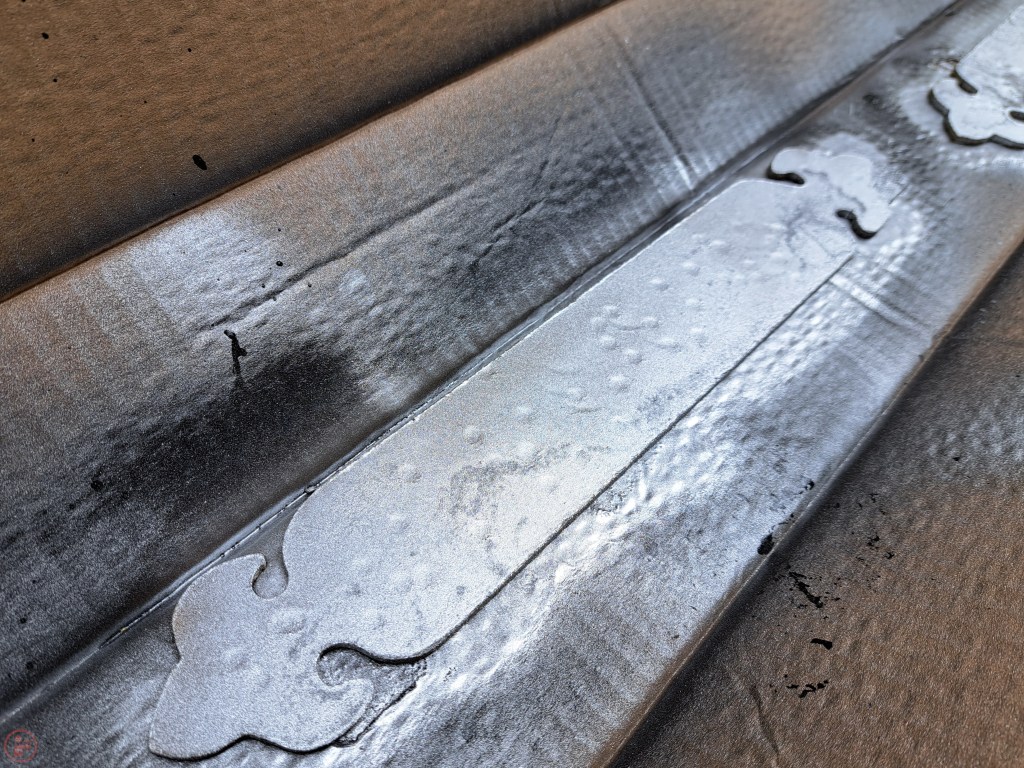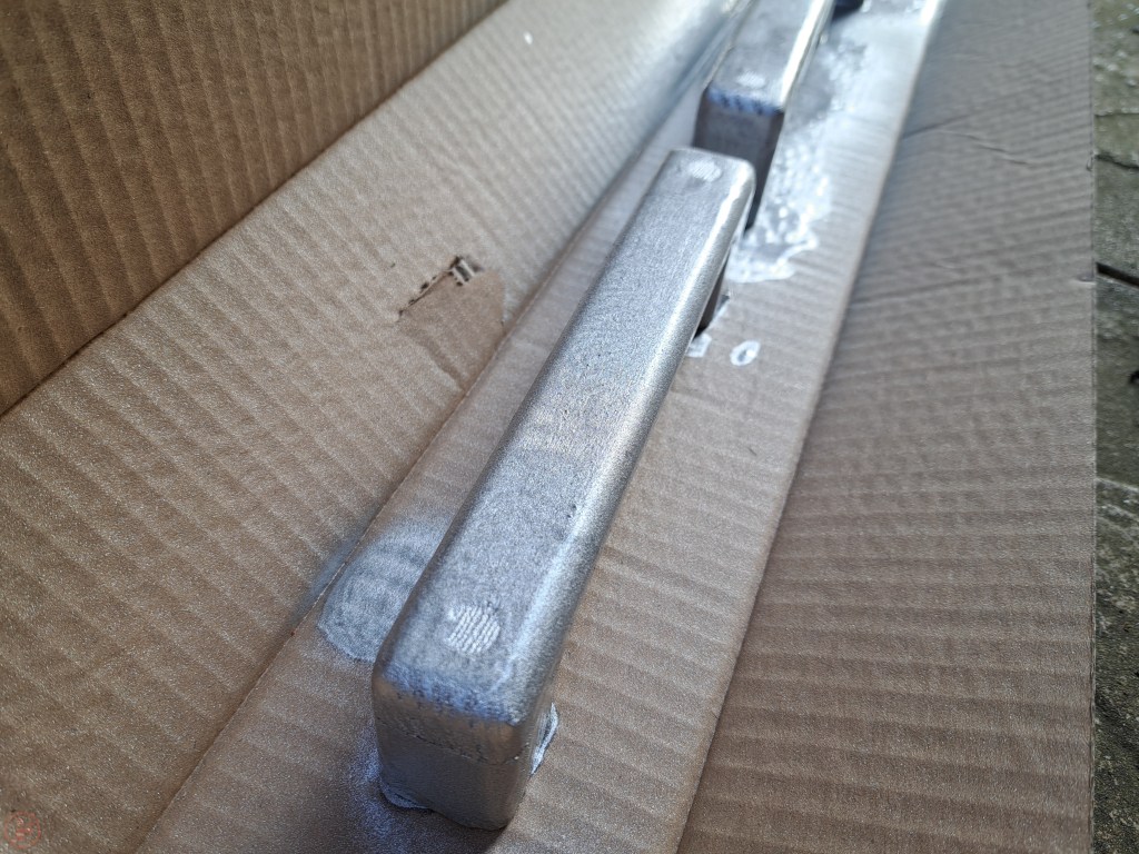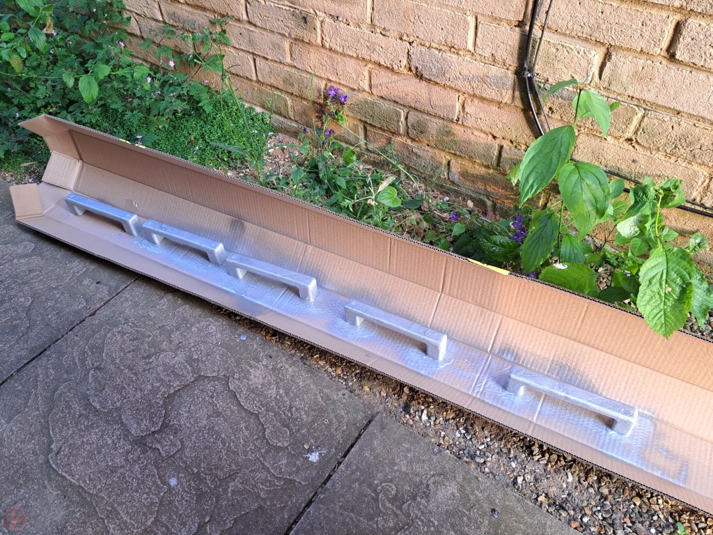 I applied a base coat of a matt silver spray paint, using some scrap cardboard as a backing. I have used spray paint before and always prefer to use it outside due to the strength of the fumes in a small workshop!