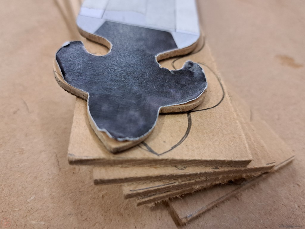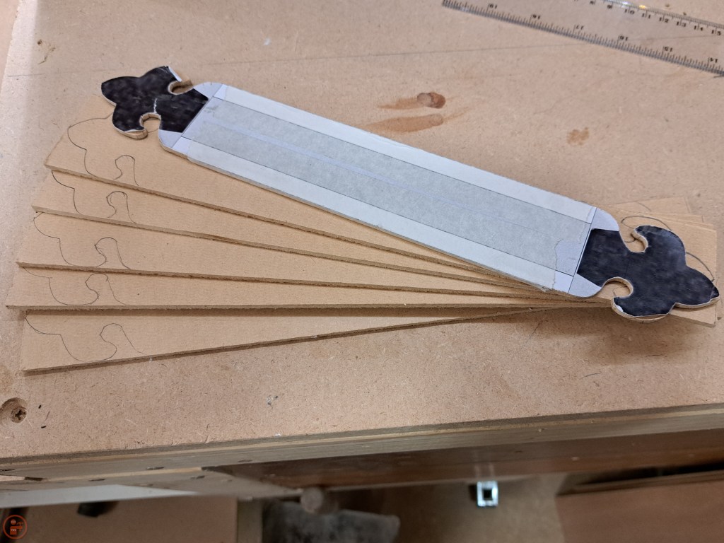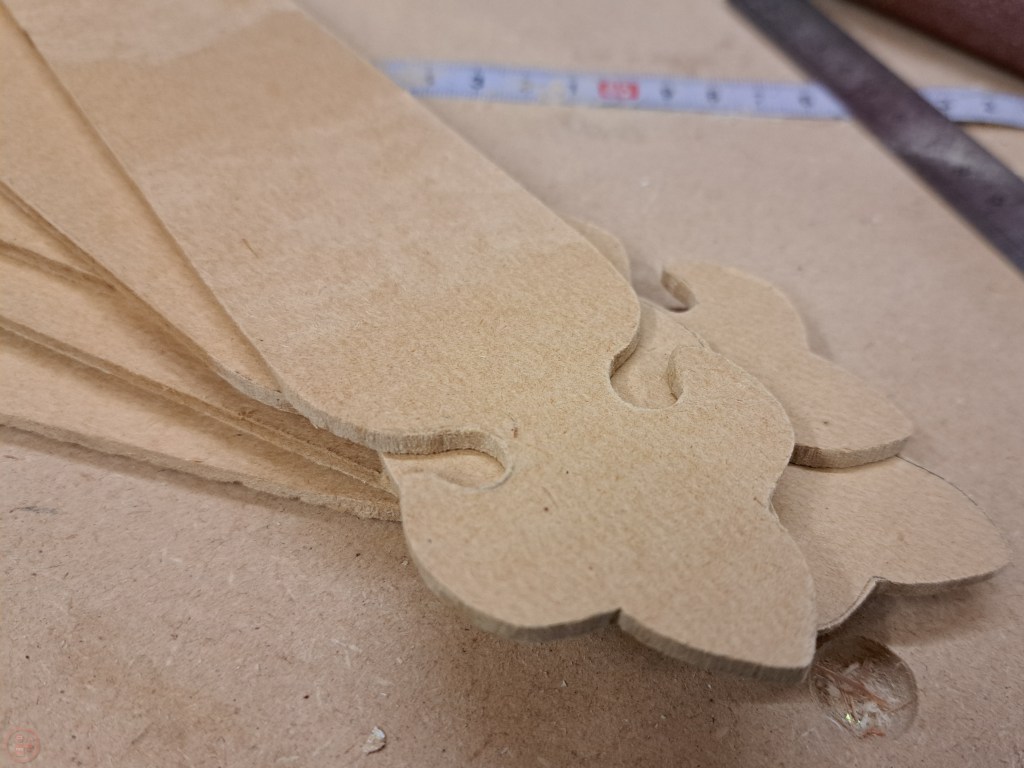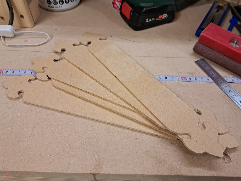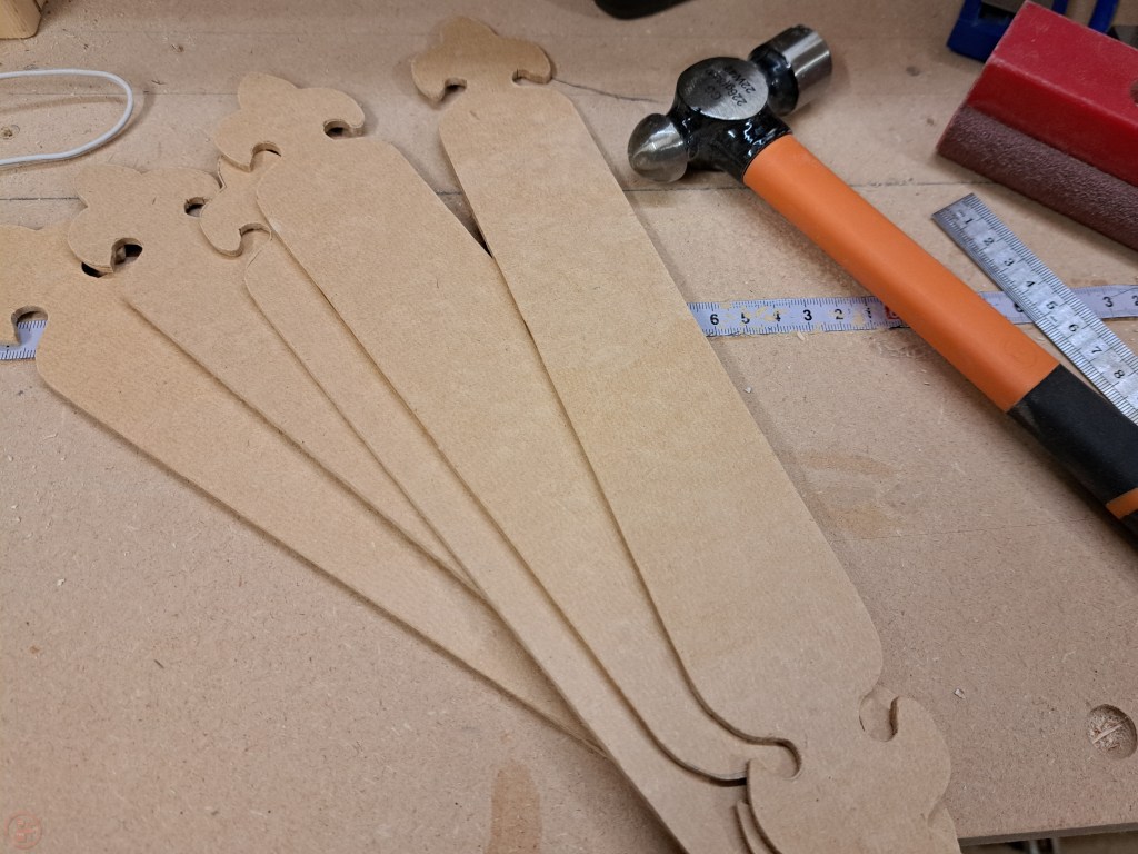 I decided to create a backing plate to go between the handle and the drawer fronts, to add a bit more decoration to the design. I made a template using a decorative design and used that to create five backing plates out of hardboard. I used my scroll saw to carefully cut out the curved sections of the design, which took a bit of time doing five times!