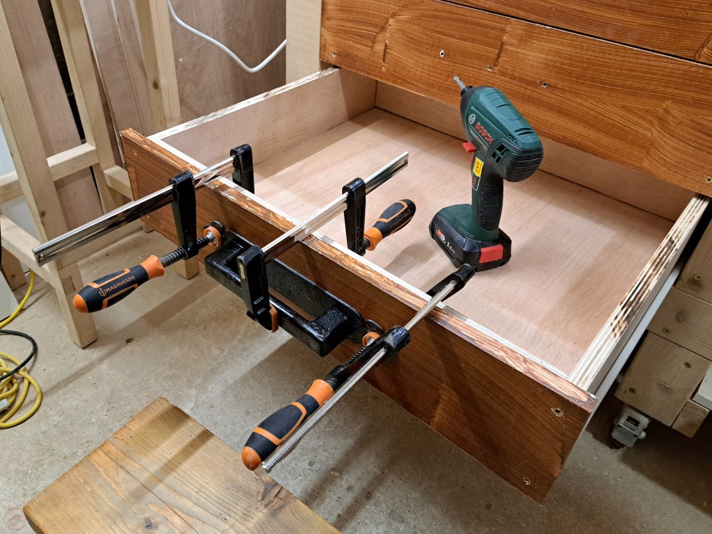 Once the spray paint was fully dry, I clamped the backing plate in place to the drawer front. I drove screws into the handle from the inside using my impact driver, sinking the screws into the drawer body in the previously-drilled countersink holes.