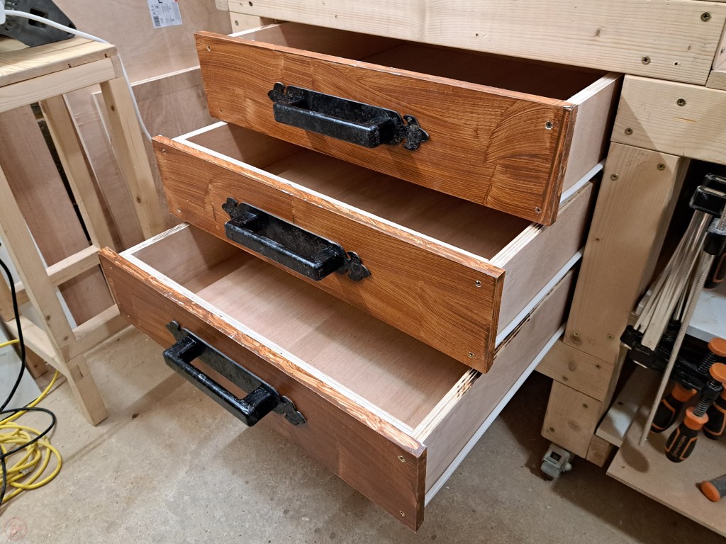I’m really pleased with how these turned out – the spray paint was a bit of an experiment but it seems to have worked really well, and the black handles stand out nicely against the brown draw fronts. I like the sort of medieval aesthetic they represent, so I shall definitely do more experimenting with future projects! 🔨
