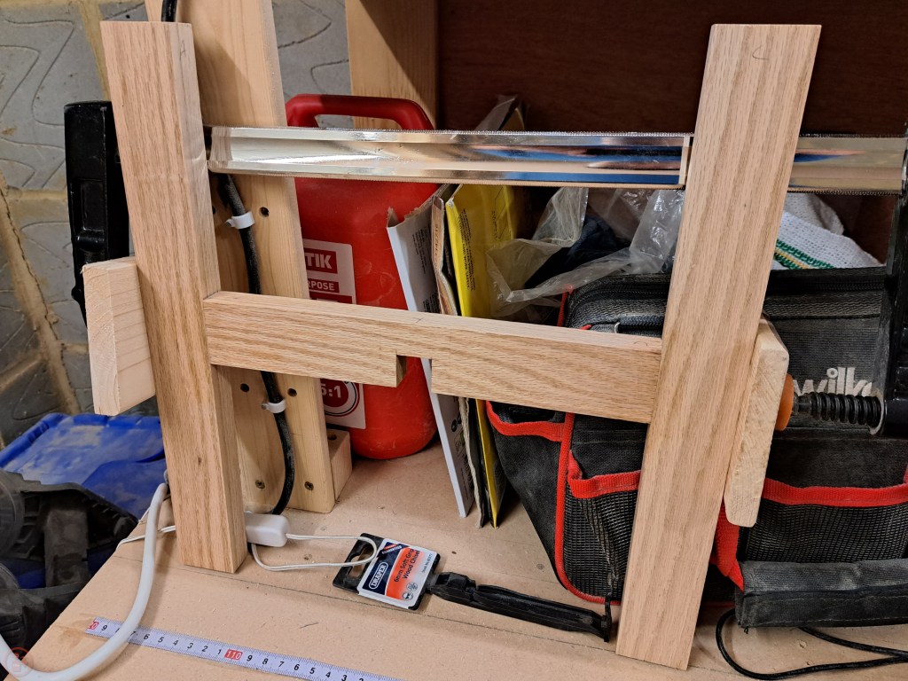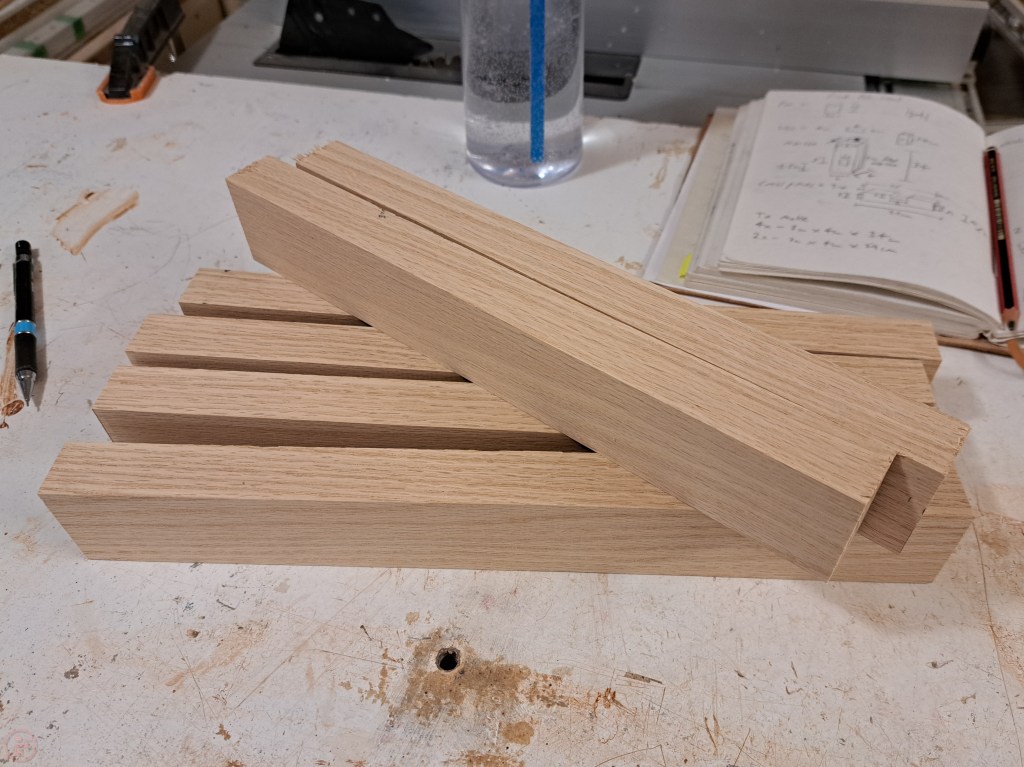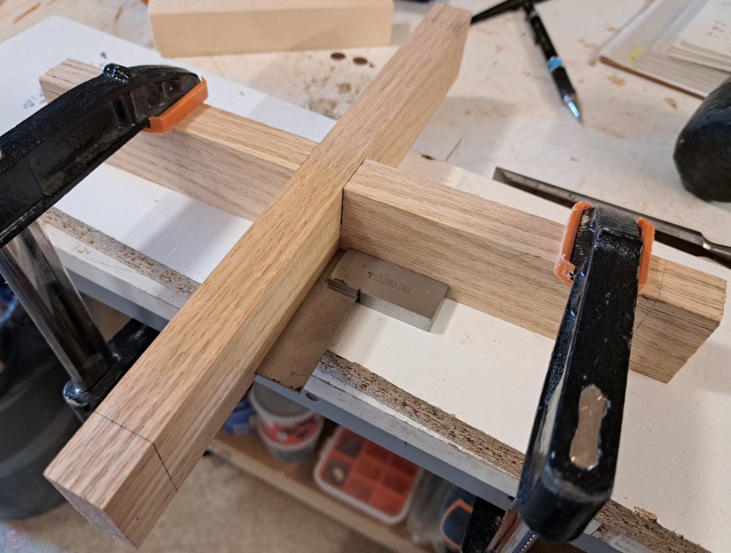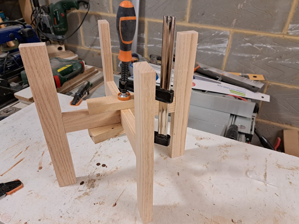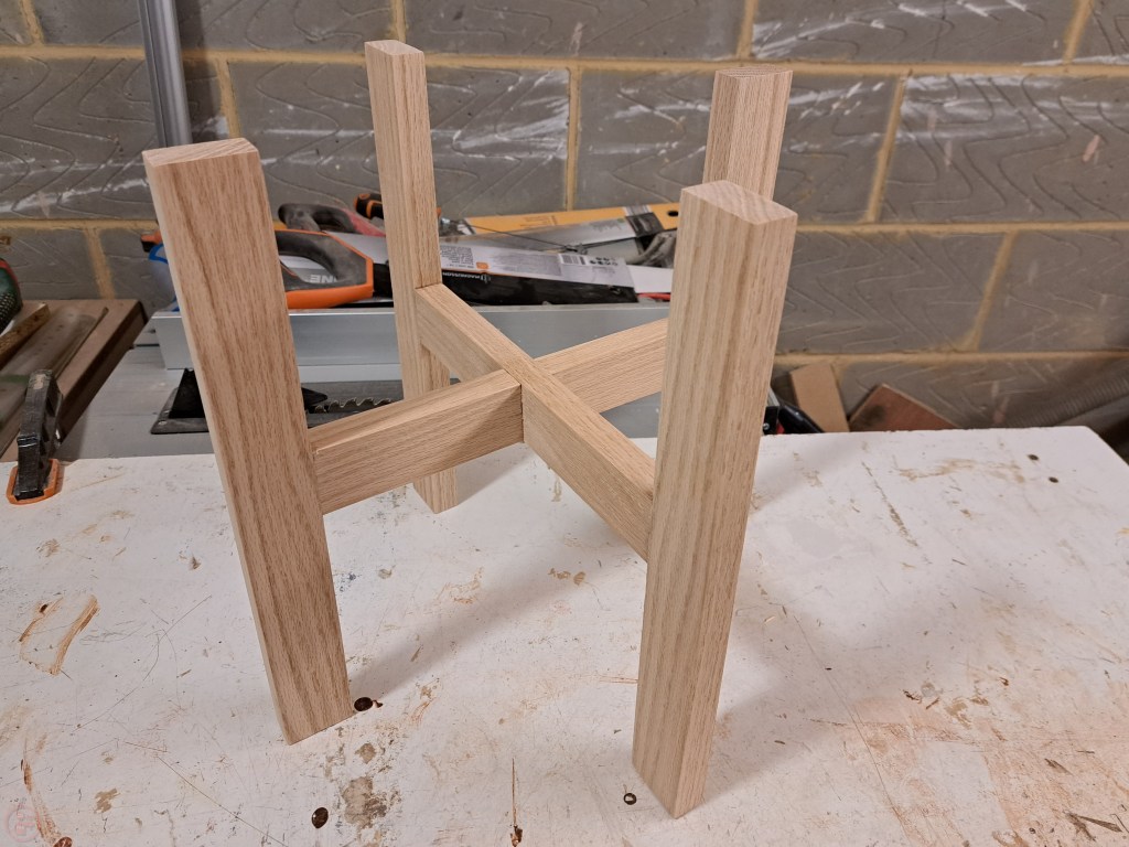 I glued up the second pair of legs with the centre piece, making sure the centre piece was in the opposite orientation, to ensure the two “H” shapes could slot together. Once the glue had fully dried on both parts, I did a quick test fit and then glued the centre pieces together to form the completed stand. I left this to dry overnight before a final hand sanding up to 120 grit.
