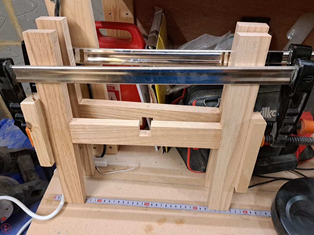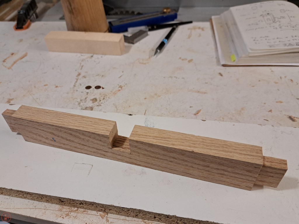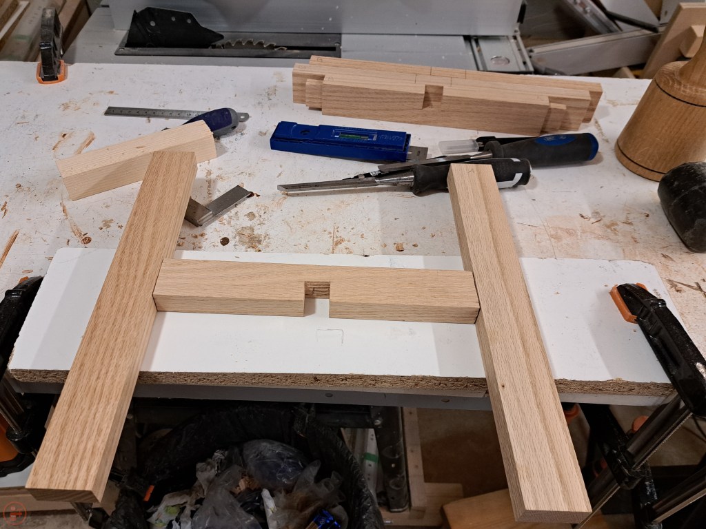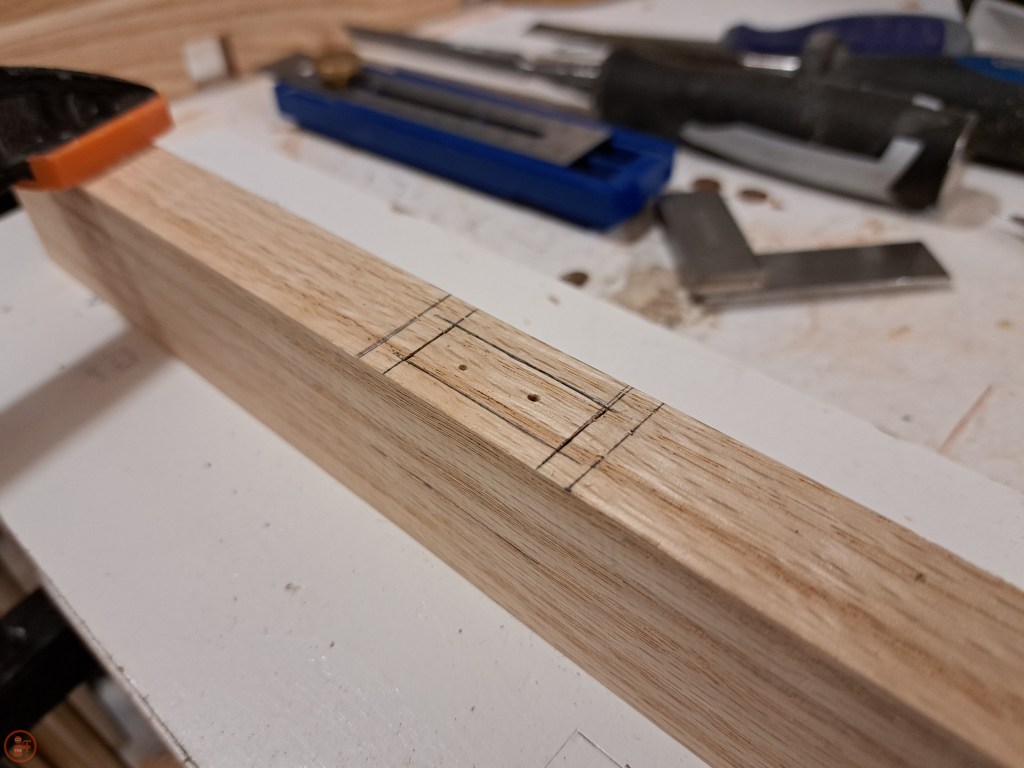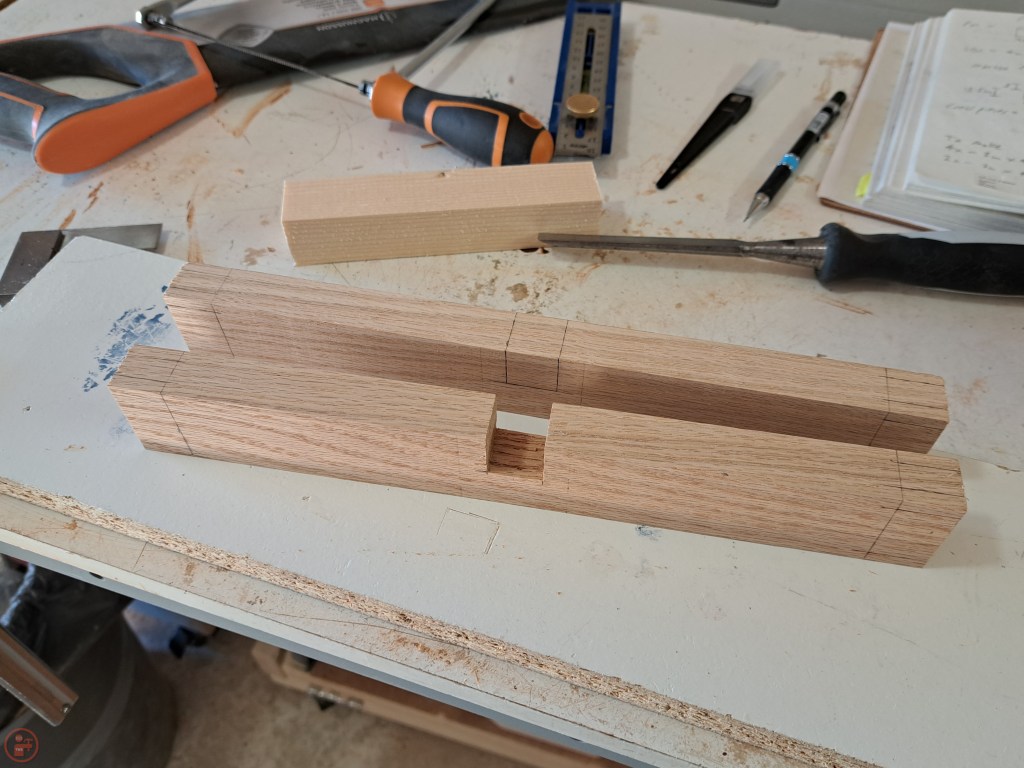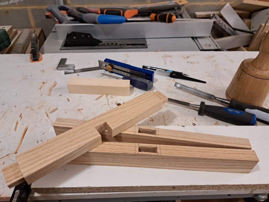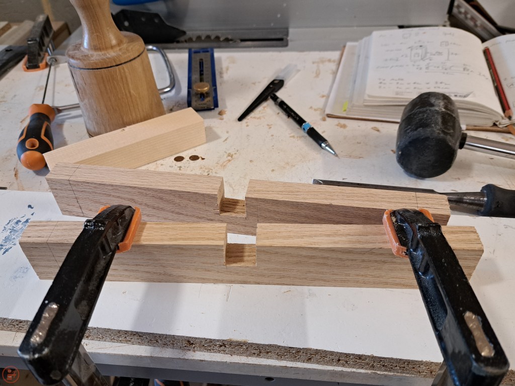 I then moved on to making the legs – these needed corresponding mortices, so I marked out the locations, ensuring the same height up from the ground on each leg. I made pilot holes and used a hand drill to remove some of the material from the mortice. I used my marking knife and chisels to refine the shape and then completed a dry test fit of the first joint. This worked very nicely and so I repeated the process for the second leg and then glued up both joints to make a letter “H” shape. I then did the whole thing again twice more, matching the other two legs to the remaining two tenons to ensure a snug fit.