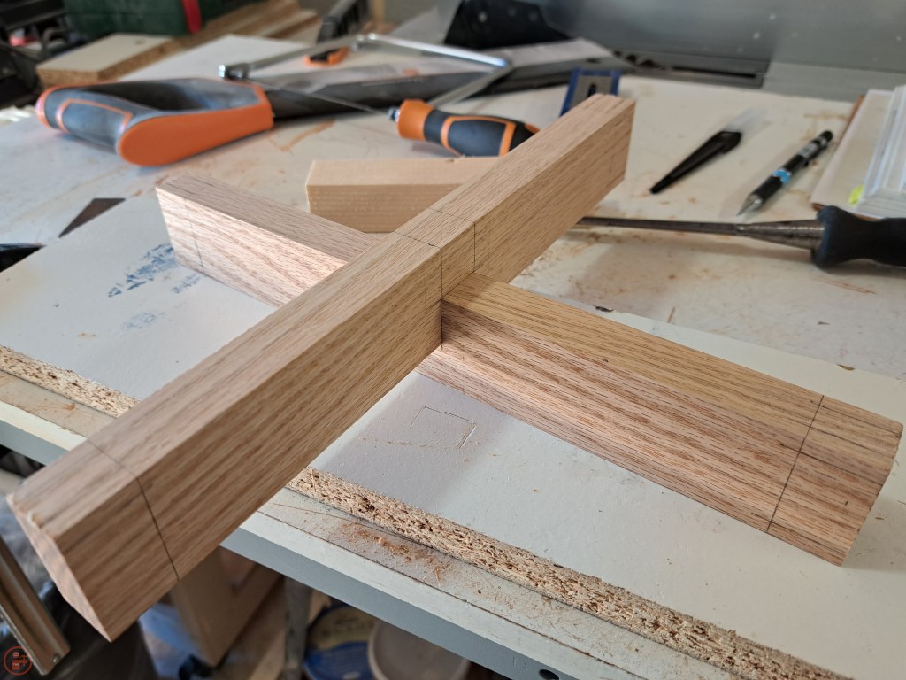 I decided to make the plant pot stand out of oak, as it would be nice and sturdy and I love the colour and grain. After cutting the pieces to the correct dimensions, I decided to do all the rest of the project using only hand tools as a little challenge to myself. I cut out the centre section of the cross pieces, where the pieces intersect, and used a chisel to remove any remaining waste material. To ensure a strong joint between the centre pieces and the legs, I decided to use mortice and tenon joinery. I also haven’t done much joinery using hard wood, so this was good practice to learn how the wood behaves! After marking the edges of the joint with a marking knife, I took my time to remove the material using a hand saw and then used my chisels to end up with a nice square tenon. I repeated this for the tenon on the other end of the centre piece, as well as for both ends of the other piece.