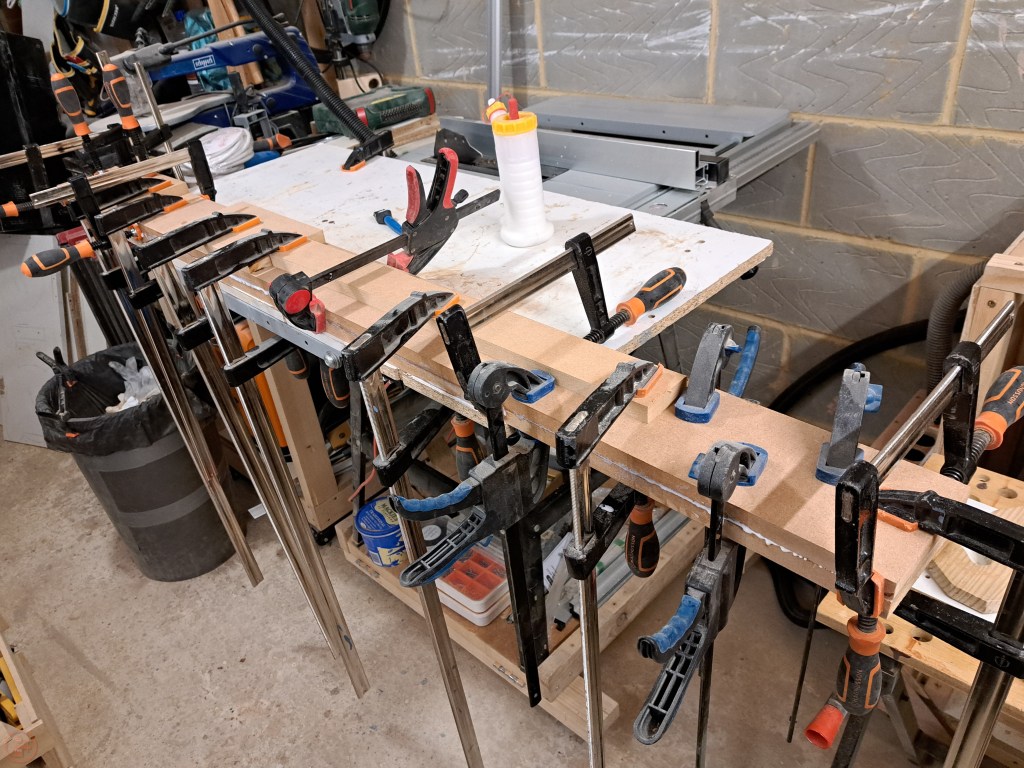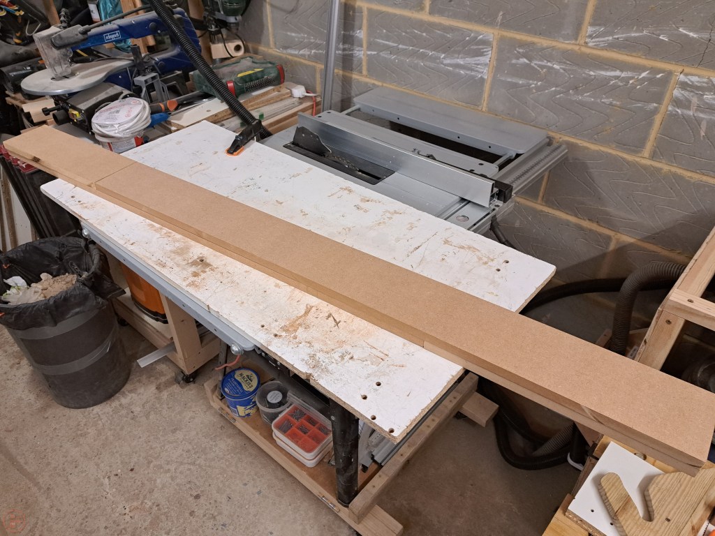 I wanted some way of having dust collection and power easily accessible wherever I was in the workshop. I came up with the idea of having these suspended above my head, so I could just grab what I needed, when I needed it without having to unwind or layout cables every time I wanted to use my random orbit sander for example. I settled on some kind of support arm and did some research online for ideas. I stumbled across a fantastic YouTube video by Jon from Lincoln Street Woodworks giving details of how to make such a boom arm. He makes his out of plywood, but as that is super expensive here (and “I hate my lungs”!) I went with an mdf option. I didn’t have a single piece of 18mm mdf that was long enough for what I wanted, so I laminated some pieces together to get the required length, as well as increase the thickness and strength.