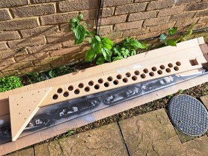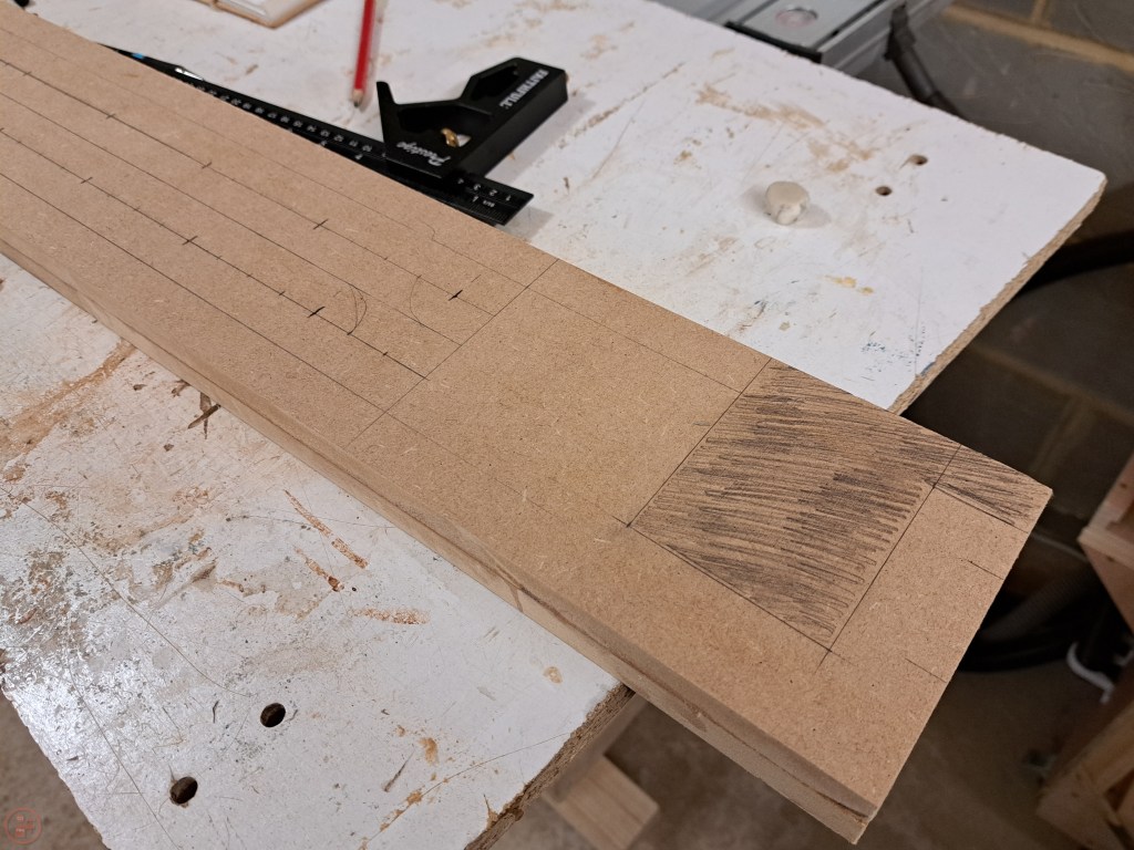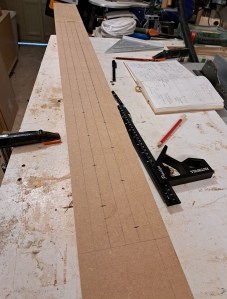 After putting down a good amount of glue, attaching a million clamps, and waiting for a bit, I set about drawing on the various marks for cutting and drilling. Jon recommends a hook shape on the end to loop cables etc over, so I drew out the designs for that. I also liked Jon’s suggestion of drilling holes at regular intervals in two off-set rows the length of the boom arm to reduce the overall weight on the hinges.