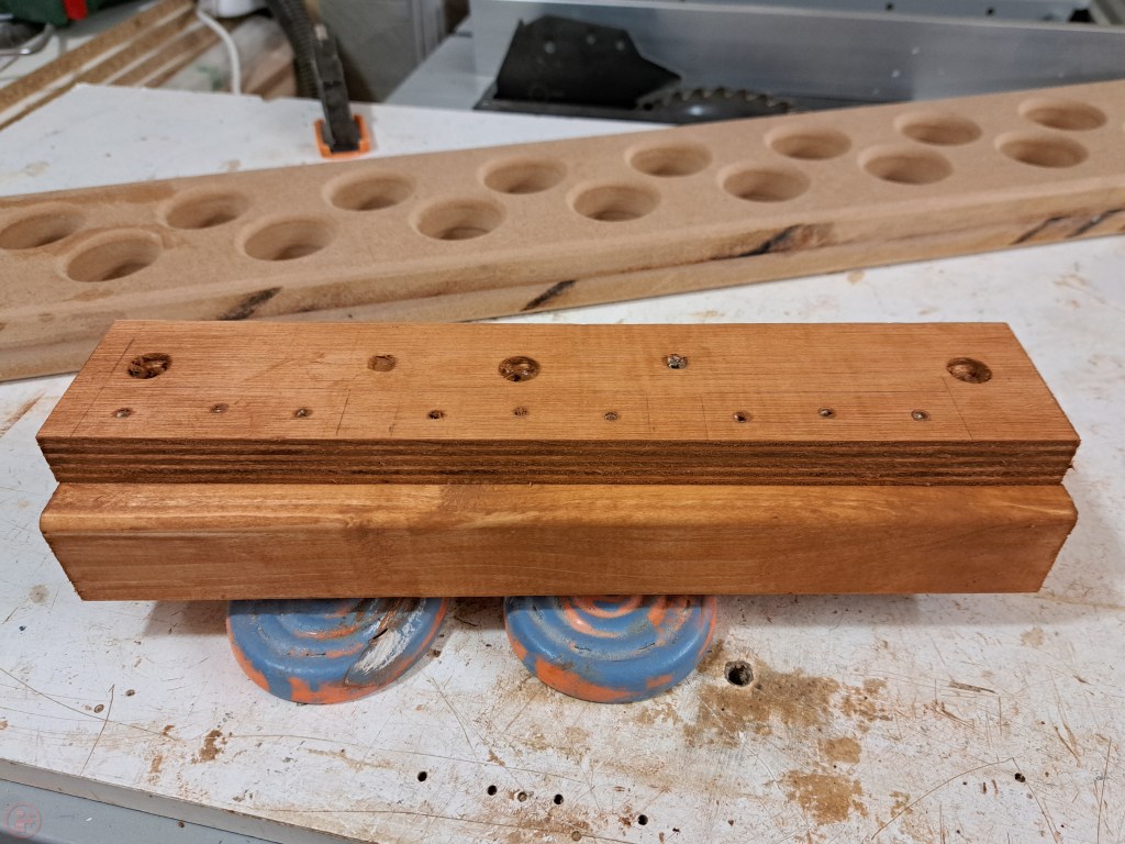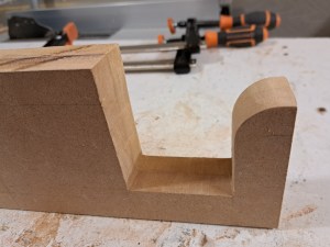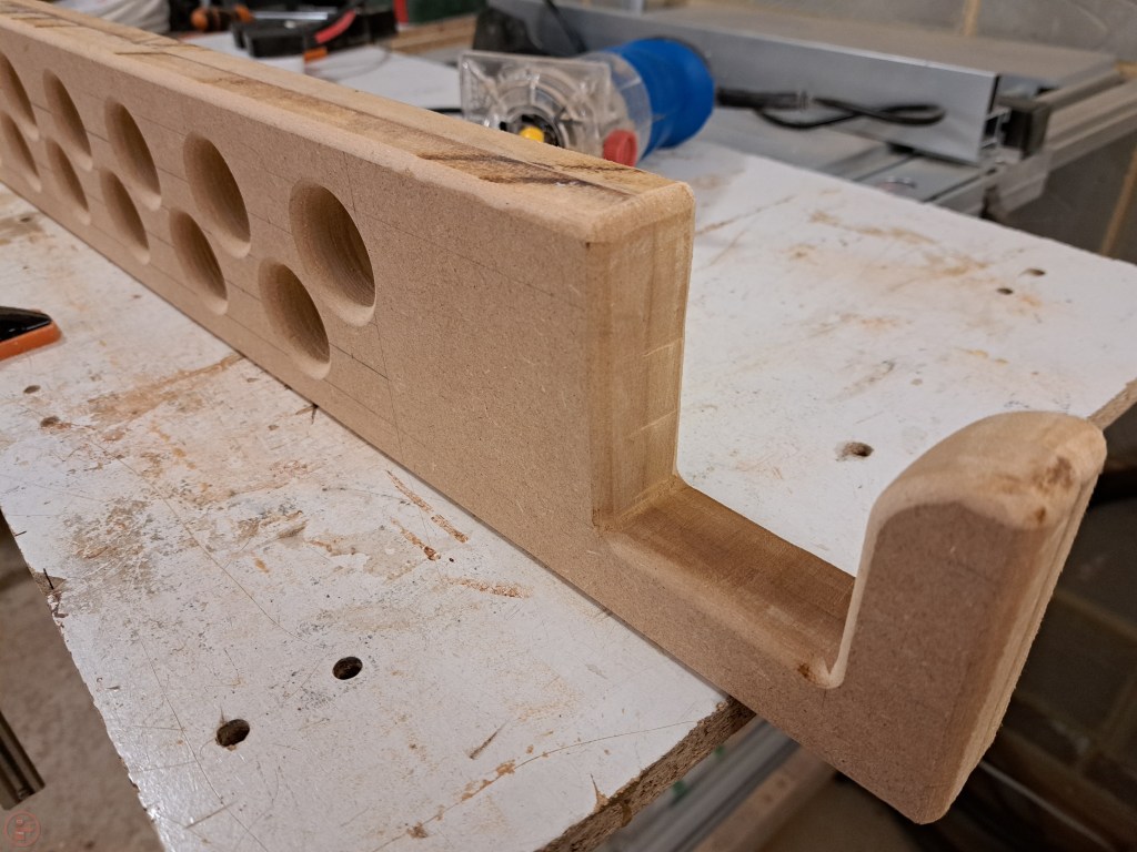 I notched out the section for the hook part and decided to add a curve to the end to encourage a looped cable to fall into the hook section. Plus it softens the look slightly too. After drilling what felt like a never ending number of holes, I grabbed a roundover bit and used my palm router to soften the edges of all of the holes, as well as all the sides of the boom arm and hook.