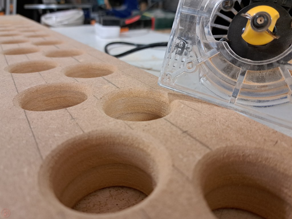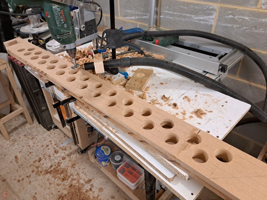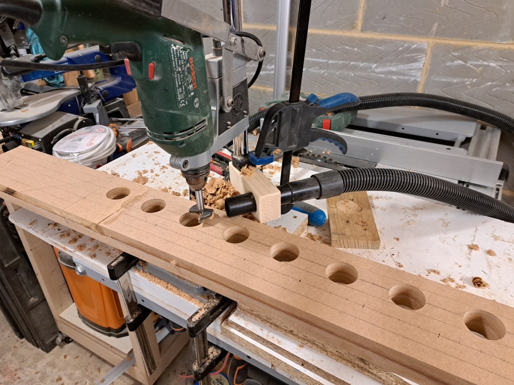 After marking all the drilling locations I got out my jigsaw and set up the drill press stand. It was at this point I realised how useful it would be to have a boom arm to help me collect the sawdust!