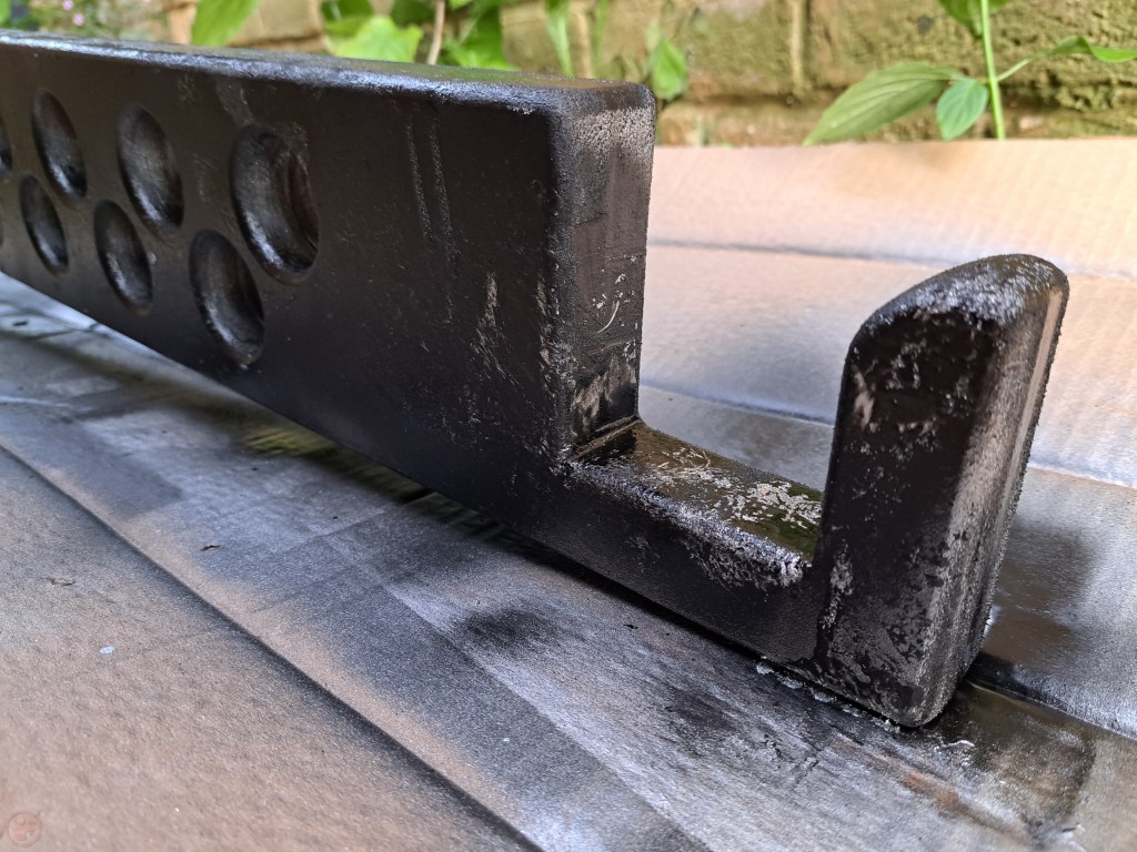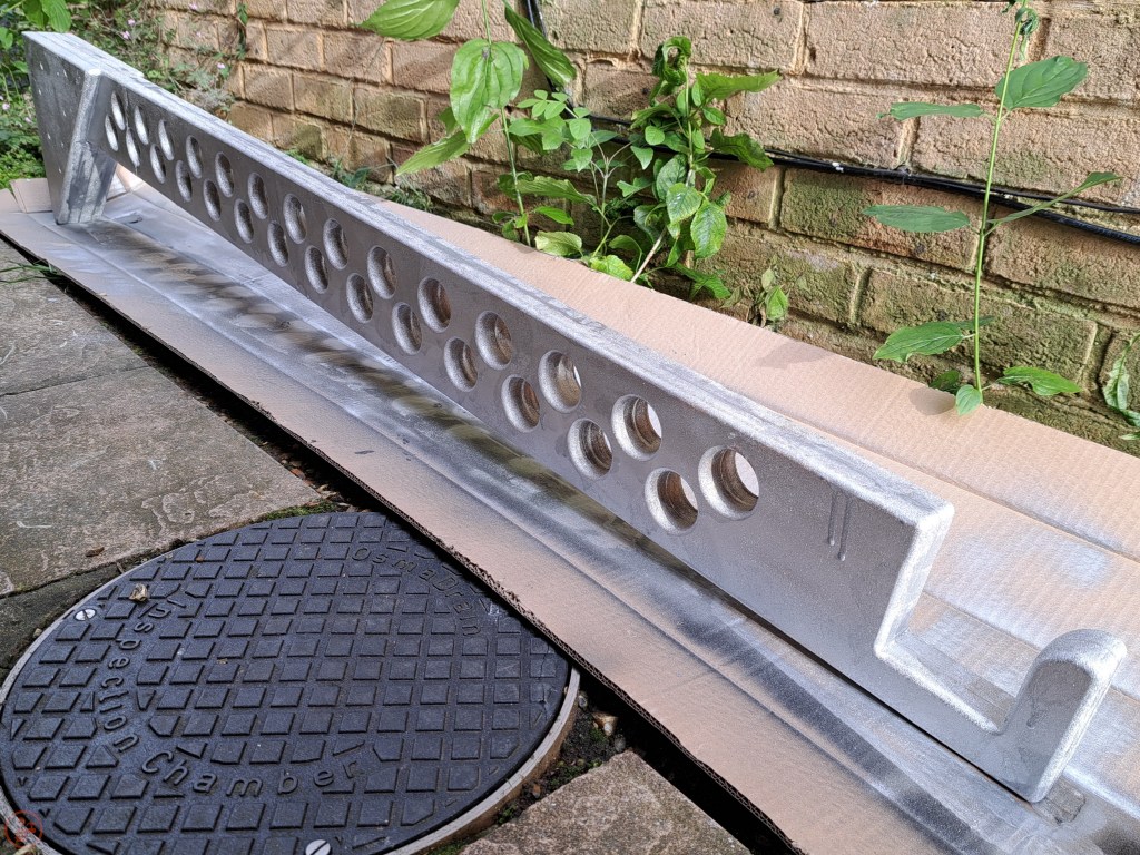 I decided to use the same decorating/finish method that I used for the mitre saw bench drawer pulls and the upgraded electrics box handles – using silver and black spray paint to create a sort of wrought iron effect. I moved the boom arm outside onto some scrap cardboard to catch the overspray. I applied a good coat of silver paint and then, once it had dried, went over it with some matt black spray paint. I used kitchen towel to blot at some of the wet black paint to remove it in places to expose the silver underneath.