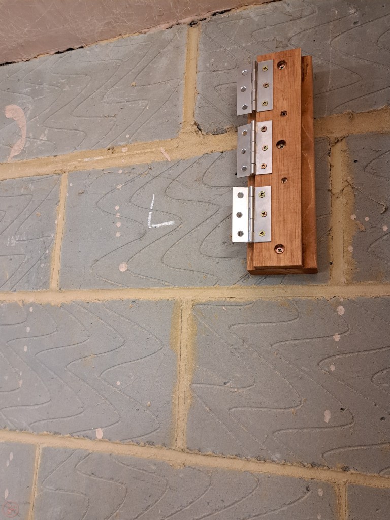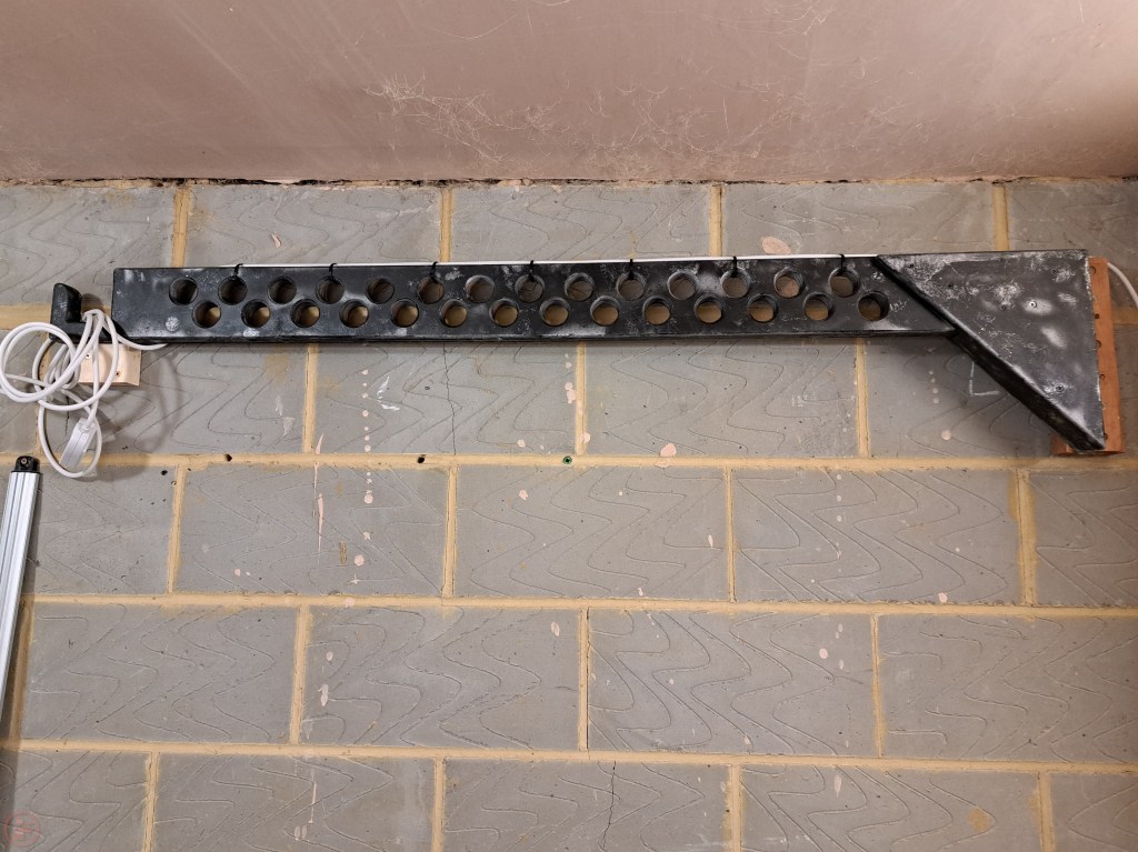 While the spray paint finished drying, I mounted the hinges to the block and secured the block to the wall. I labelled up an extension lead to run the length of the boom arm and then brought the now painted boom arm back into the workshop. I pre-drilled holes for the hinges and then mounted the boom arm to the block using screws through all the hinges.