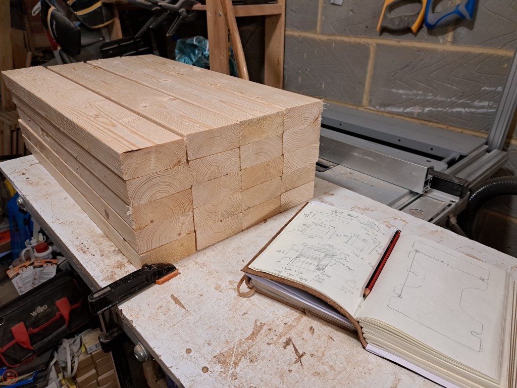 After doing a load of reading for the optimum height of an anvil (generally considered to be around knuckle height when standing with a clenched fist, or about 76 cm (30 inches ) from the ground, allowing for comfortable hammer swings), I drew up some plans. I decided to make the stand out of 2x4s laminated together to make a large block, as this made it easy to get a consistent size and meant I could ensure there were no gaps or weak points in the wood.