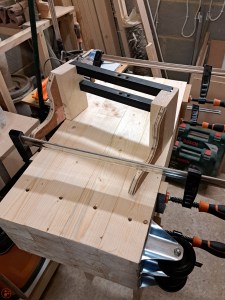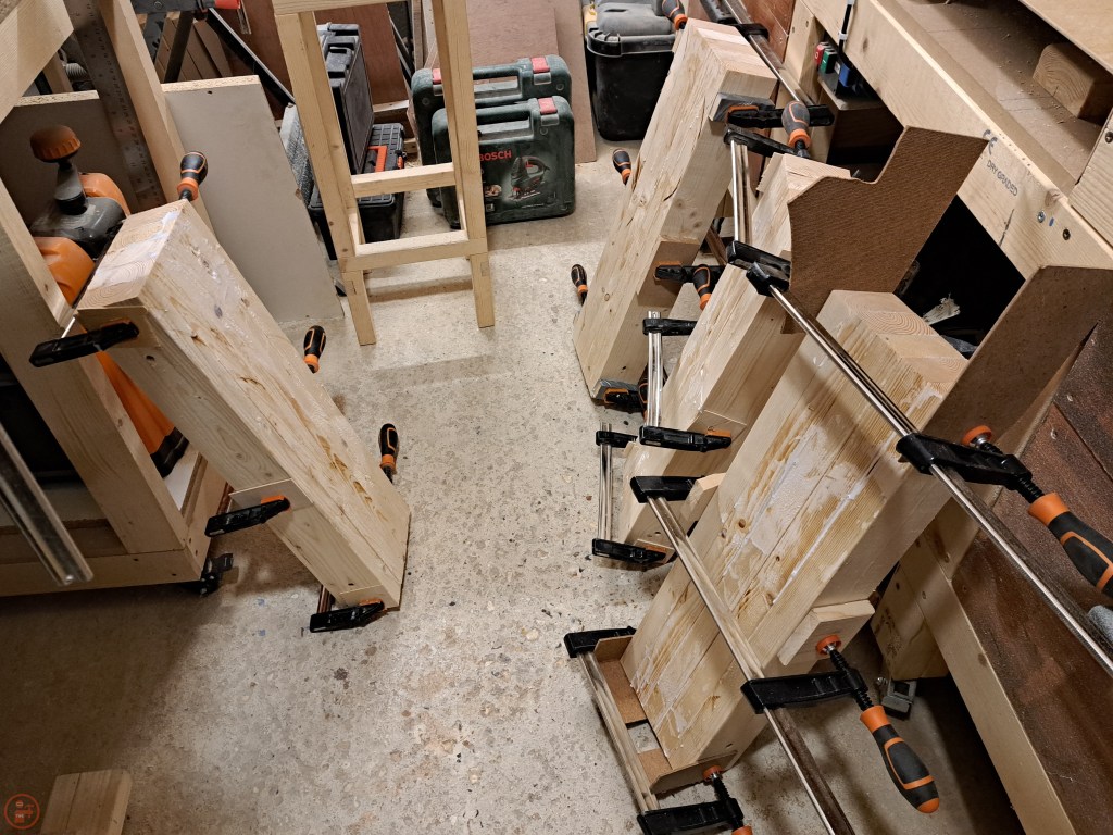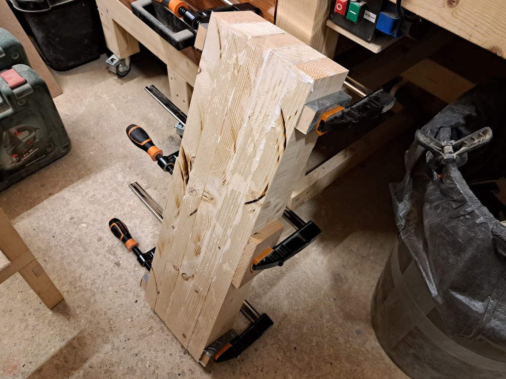 I turned my attention back to the 2×4 glue up at this point, and secured the two ten 2×4 sections together, using larger clamps and straps to keep it secure while the glued dried.