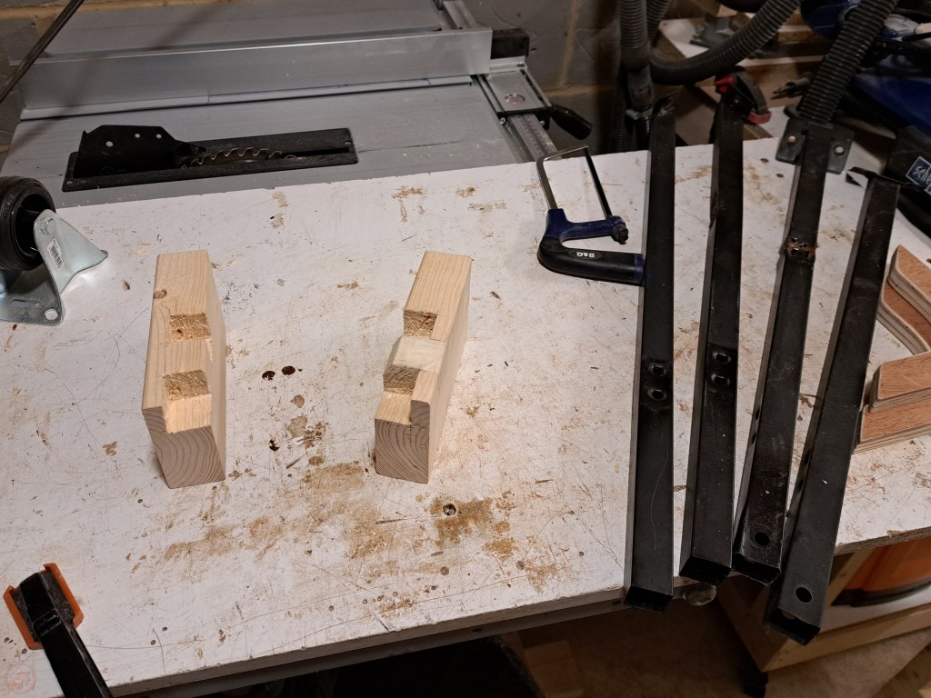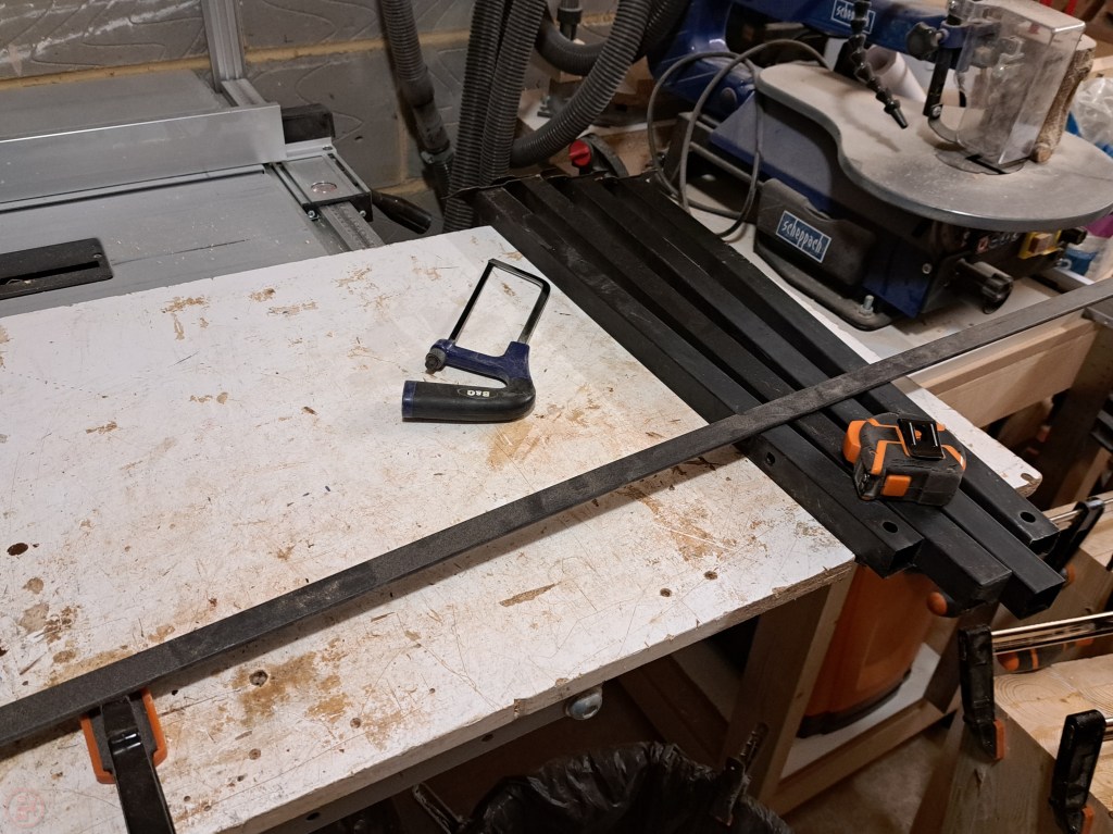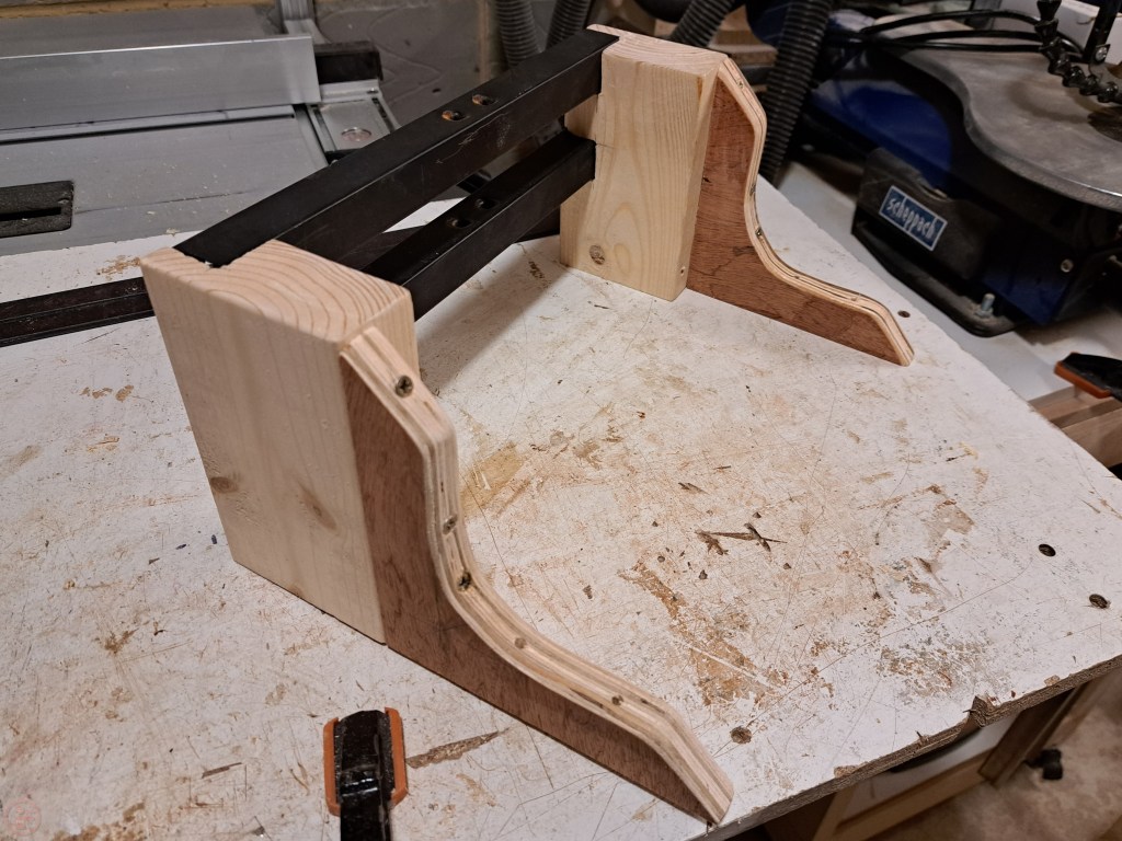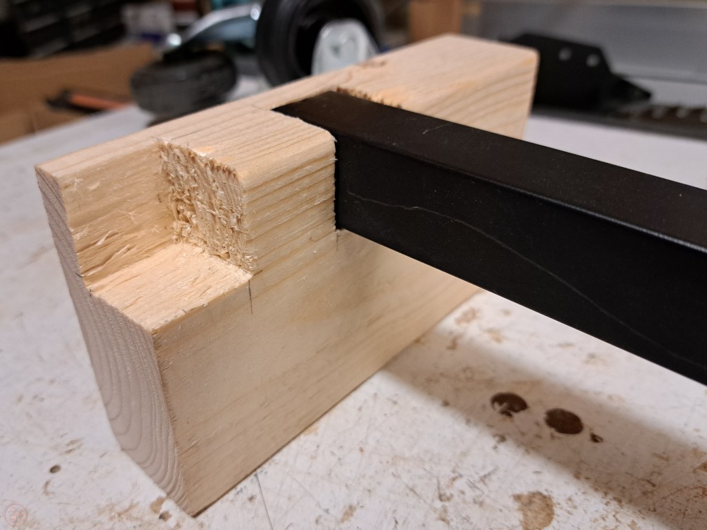 While the glue dried I decided to make a holder for the various hammers I have collected over the years, plus some newer ones for specifically working with metal. I had some scrap metal left from the legs of an old dismantled bbq, so I decided to use these as metal bars to hang the hammers on. I cut some blocks to size and notched out sections for the metal bars to slot into. I drilled holes in the metal bars just large enough to fit a screwdriver into, so I could put a screw through to secure the bar to the 2×4 block on each end. I then mounted the block to a support brace I cut out of 18mm plywood, to provide additional strength underneath the block.