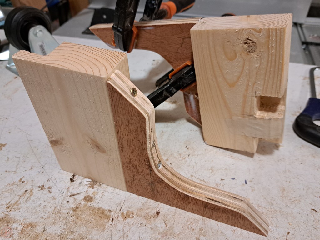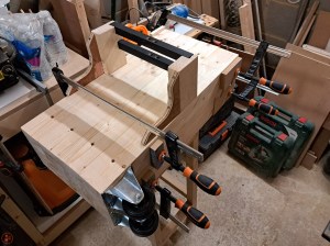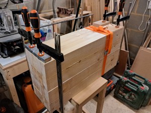I left the glue to dry overnight under clamping pressure and then glued the sections together in pairs, with each set secured with clamps and long woodscrews driven through to assist with holding everything together while the glue dried.