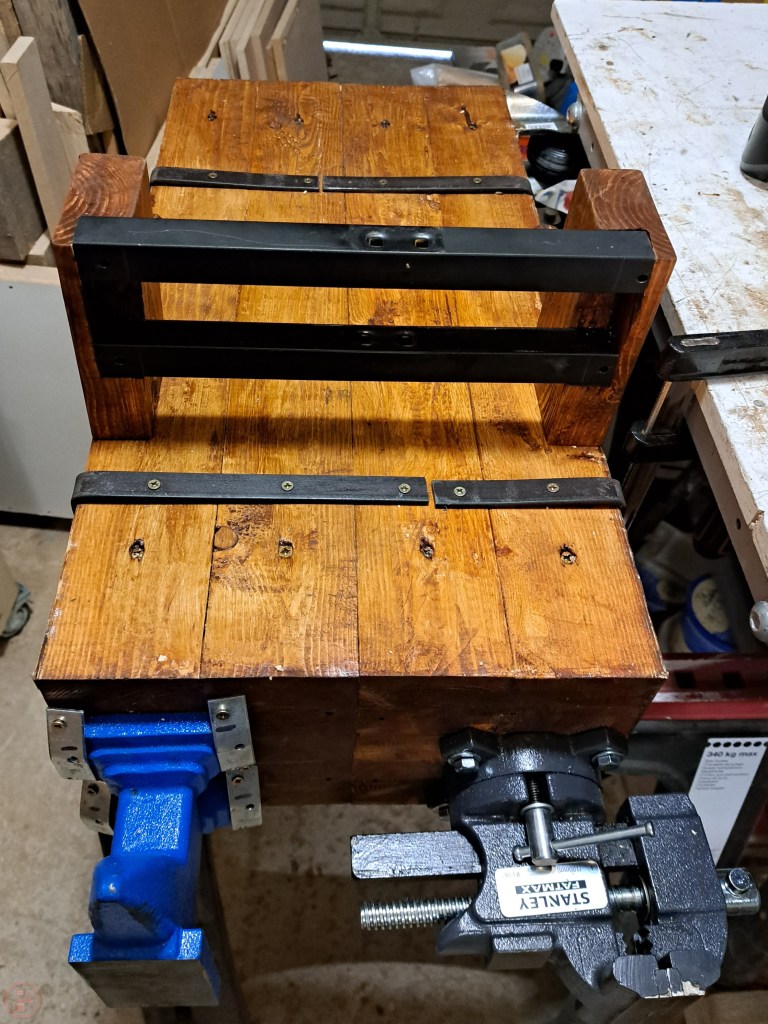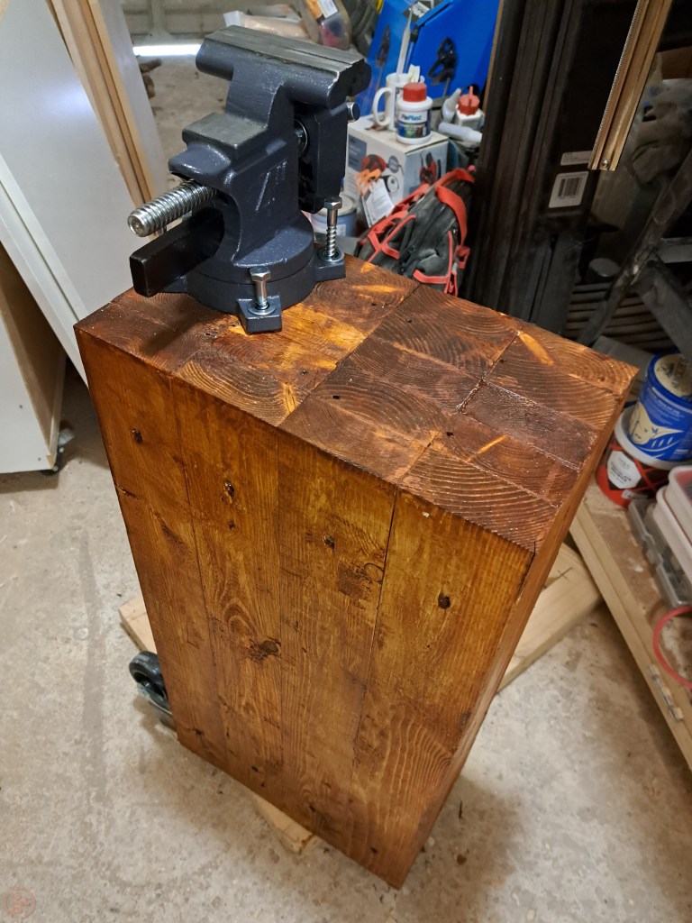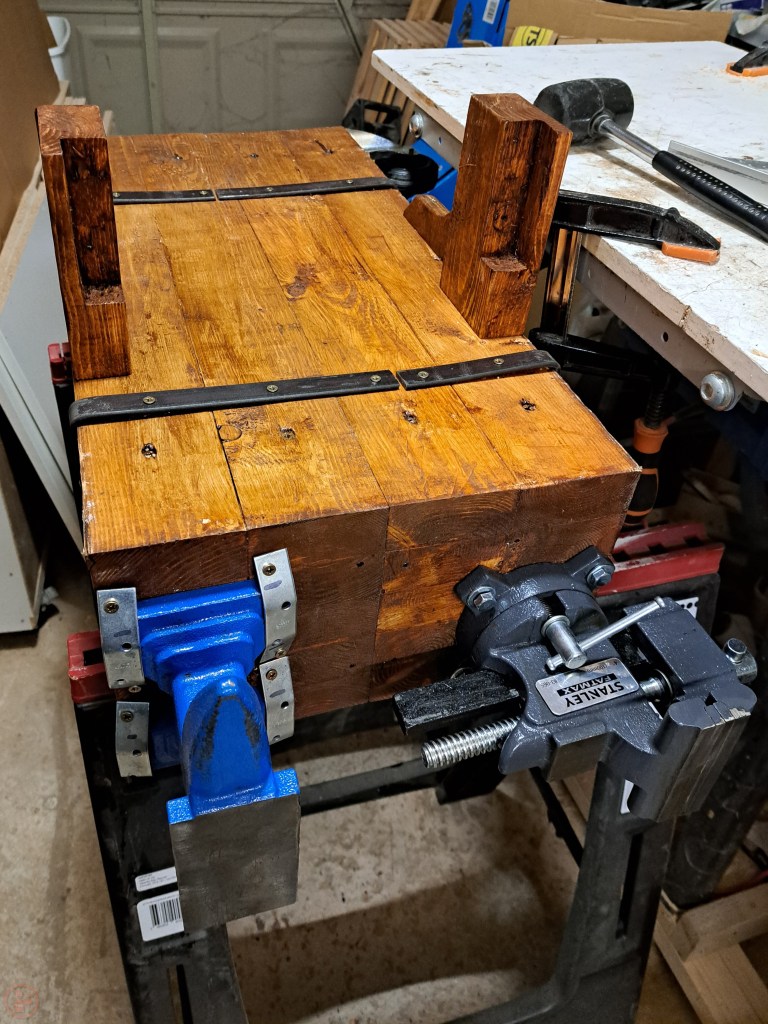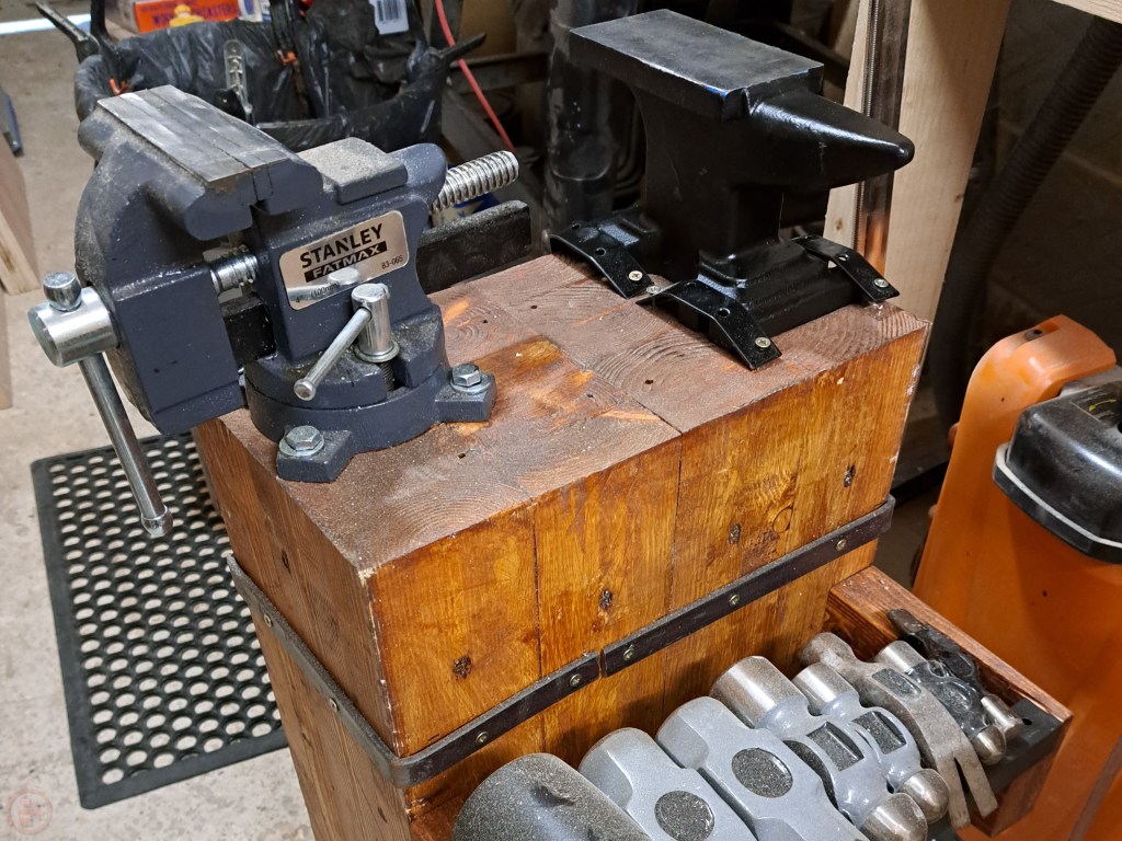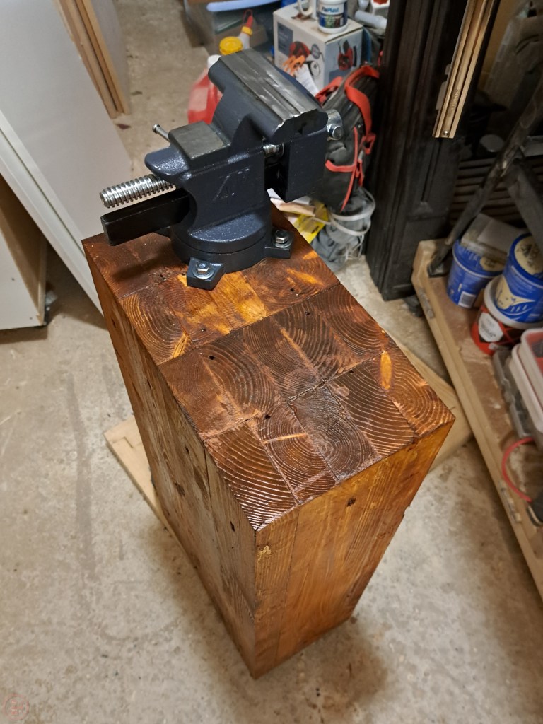 I decided to finish the pine 2x4s with a darker outdoor wood stain, as I liked the colour (Cuprinol “Rustic brown” – not sponsored!) and it will ensure the wood is nicely protected from the damp for a good amount of time. I then did some testing with the anvil and my new metalworking vice to figure out the optimum arrangement on the top of the stand. Once I had figured out where to put both tools, I drilled pilot holes and mounted the vice to one end, with the jaws slightly overhanging the edge so I can use it to hold longer metal pieces down to the floor.