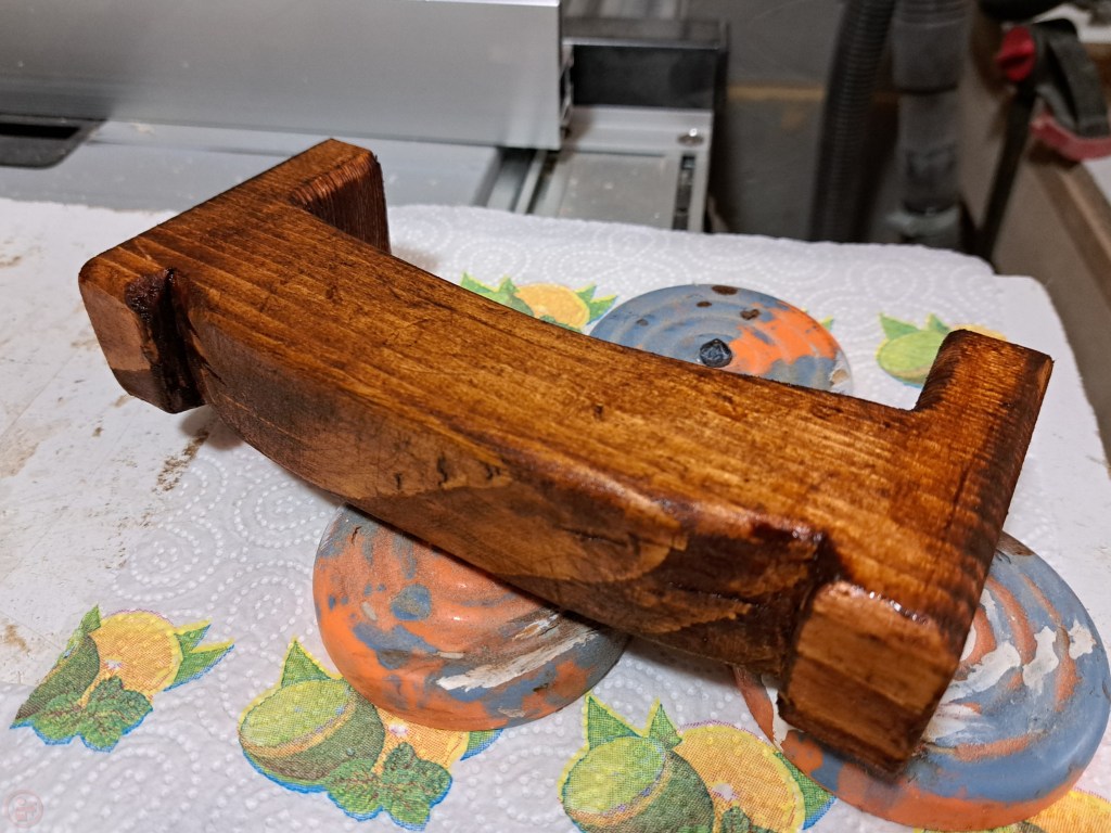 To add some finishing touches to the stand, I carved a simple handle out of some more pine and stained it with the same outdoor “Rustic brown” stain so it would match the rest of the stand. I used some black spray paint to finish the metal brackets, so they matched the black metal strapping around the stand.