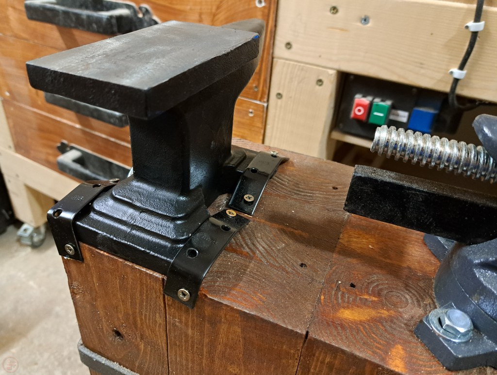 I then used the newly-mounted vice to better shape the metal brackets to secure the anvil to the stand, putting a sharp 90 degree bend on one pair of brackets to secure the anvil into both the top and the side of the stand. This should keep it nicely secure and in place.