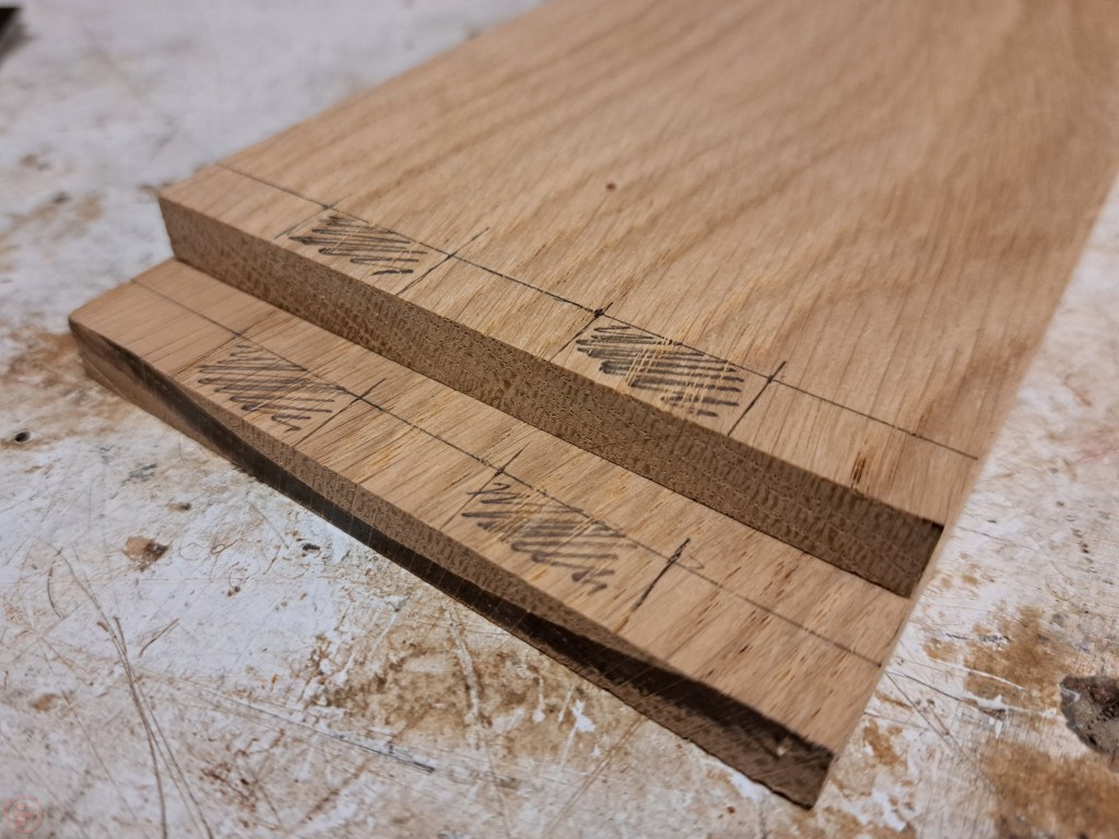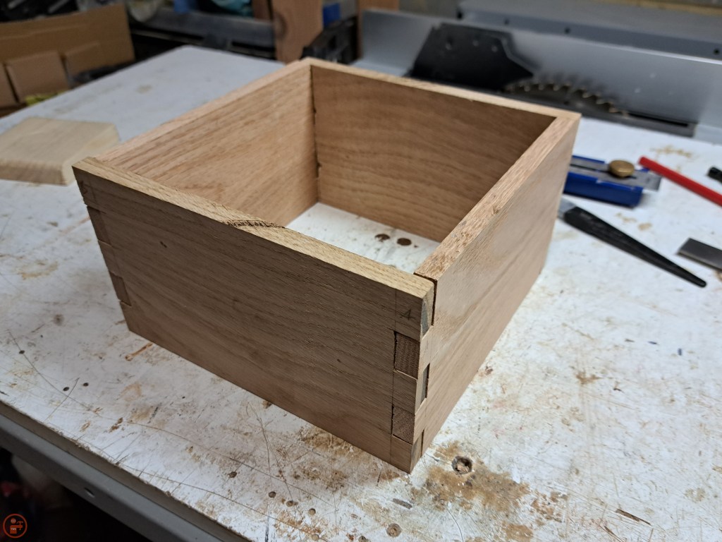 I cut the pieces to length and width using my table saw and then used my coping saw to cut out corresponding notches in each piece to make a simple comb-and-finger style joint. This provides a large surface area for glue to hold and means I can sand the edges of the joint slightly to “break” them, meaning it isn’t a super sharp corner. This makes holding the box more comfortable and reduces the chances of the wood splitting if I accidentally hit the box with something or drop it!