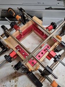 After doing a test dry fit of all the joints, I proceeded to apply glue to all the joints and make some kind of modern art with an assortment of clamps to hold it all in place.