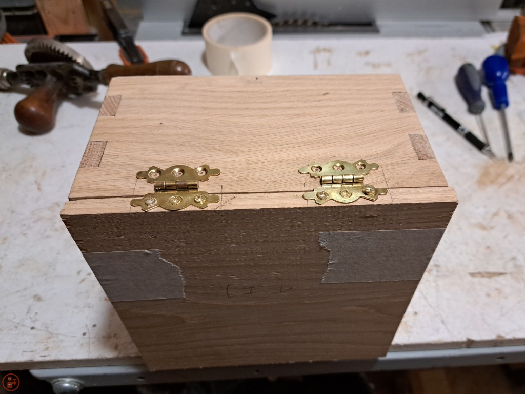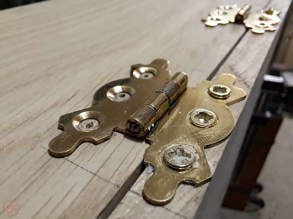 I fitted a simple base to the bottom, positioning it inside the side pieces, as it doesn’t need to take a lot of weight. I made a full width lid that sat on top of the sides, to which I fitted some decorative hinges, pre-drilling the holes using a small drill bit in my hand drill. I applied some candle wax to the small screws as I have found that makes it much easier to drive the tiny screws into the holes fully without needing lots of force and risking stripping the screw head or snapping it off!