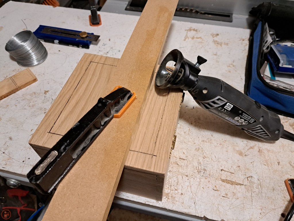 Due to the thickness of the side pieces, I had to add an extra piece of oak inside the box to give the screws for the hinges sufficient material to grab onto. I clamped the piece in place while the glue dried and then added a simple decoration to the top by using my Dremel to carve a groove an equal distance from the edge all around the lid. I used a plunge cut attachment so I would carve out the same amount consistently on all sides. I then hammered some thin silver-coloured metal wire into the grooves, securing the ends with superglue. I may add some kind of artwork to the top in future, but I am leaving it plain for now while I come up with some ideas.
